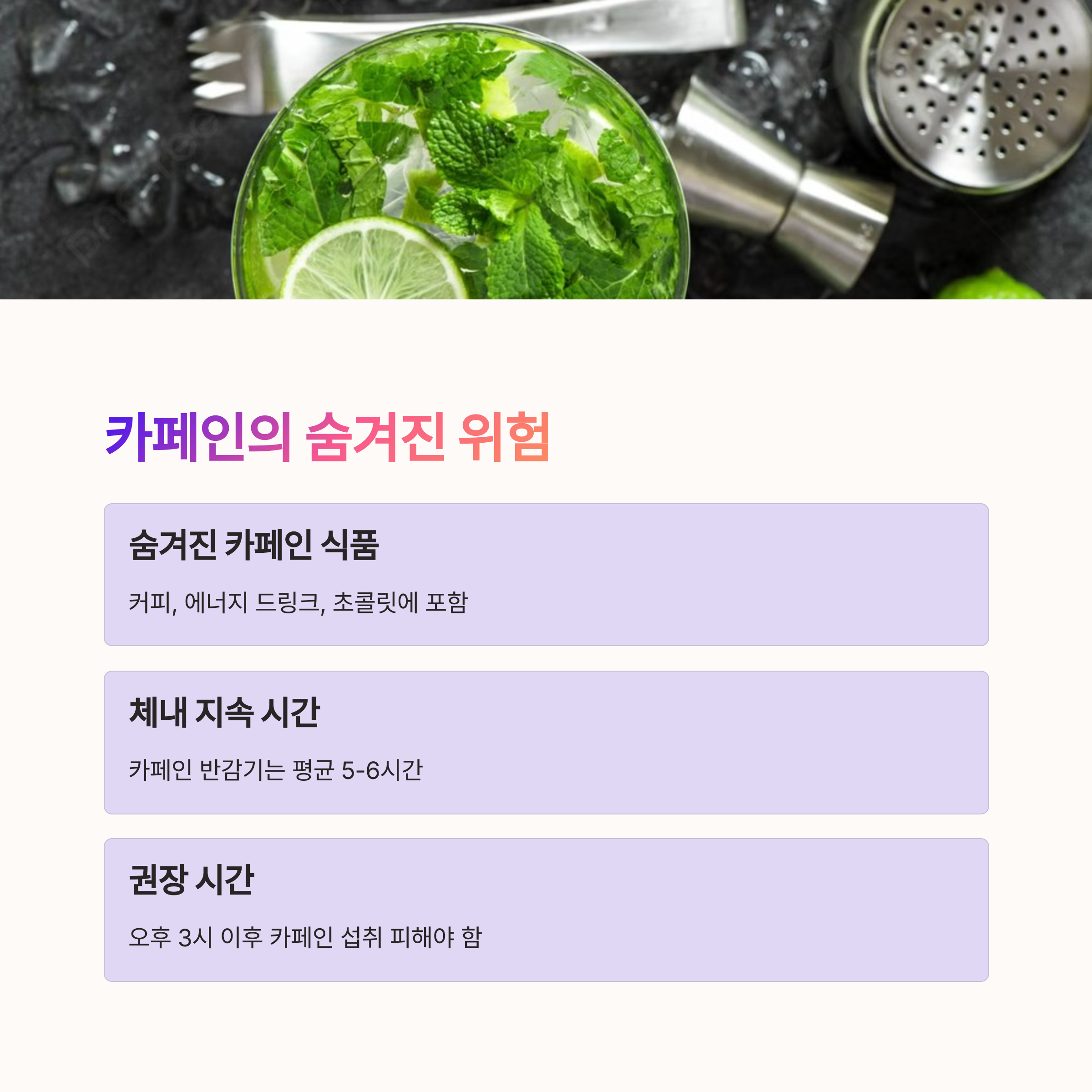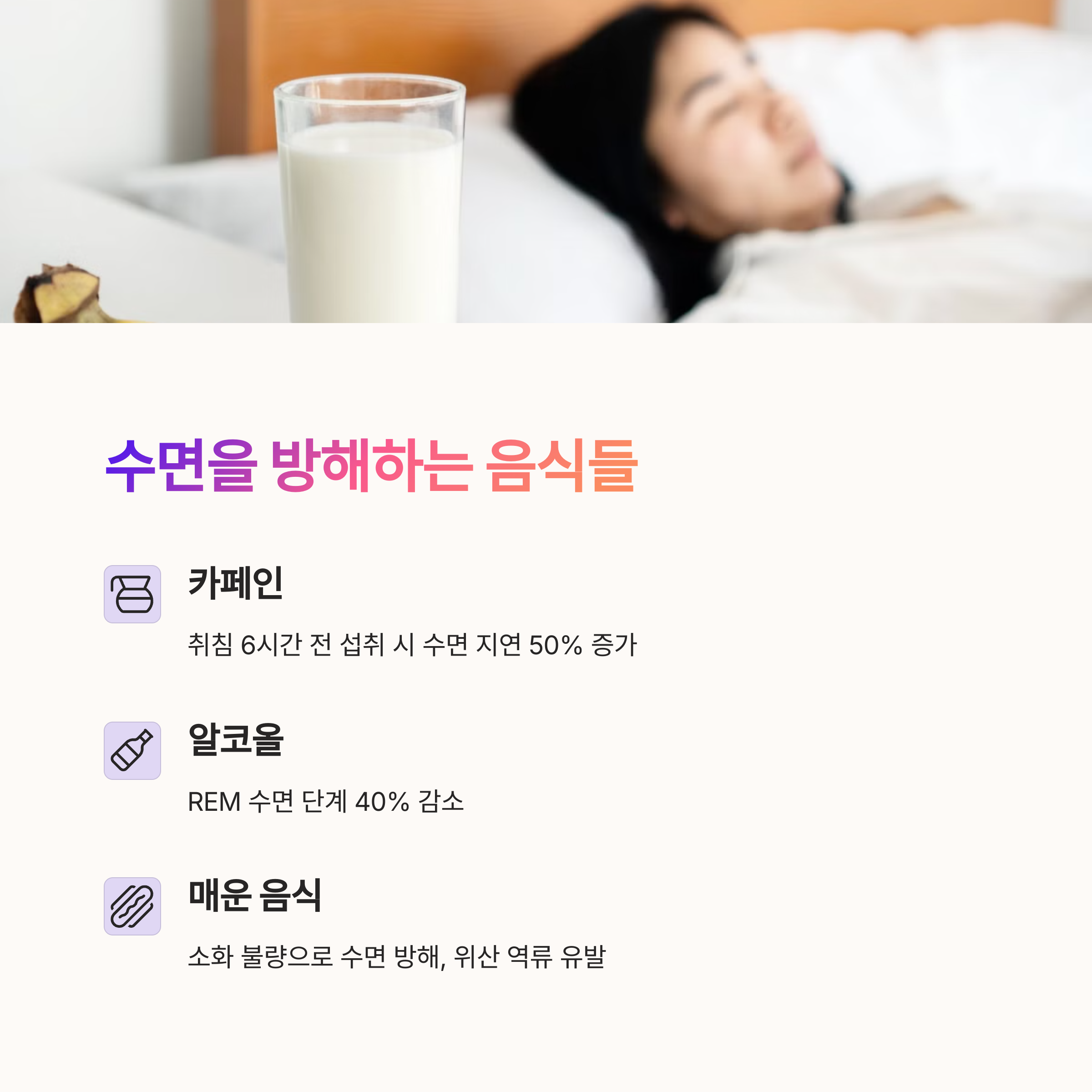 | 불면증 유발 음식 | 카페인, 알코올, 매운 음식 등은 수면을 방해합니다. |