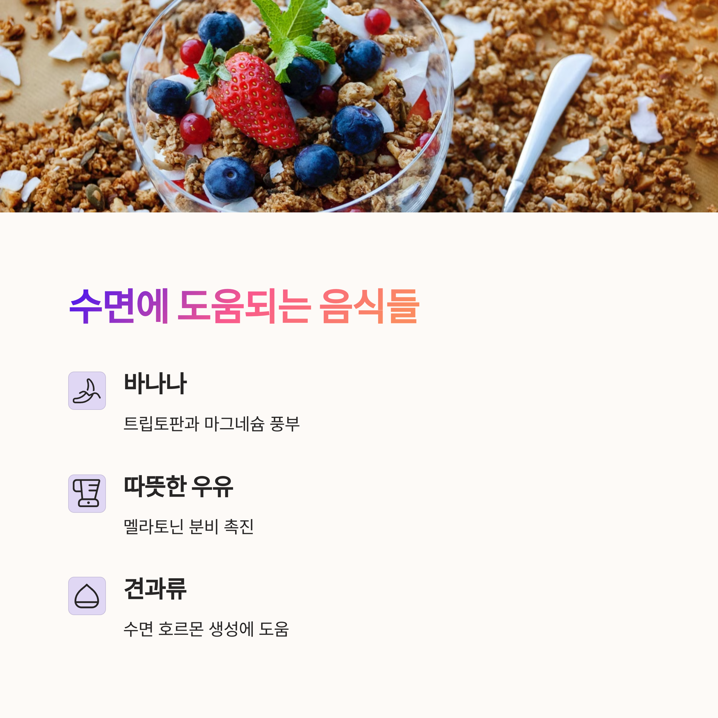 | 숙면 도움 음식 | 바나나, 견과류, 따뜻한 우유는 숙면에 효과적입니다. |