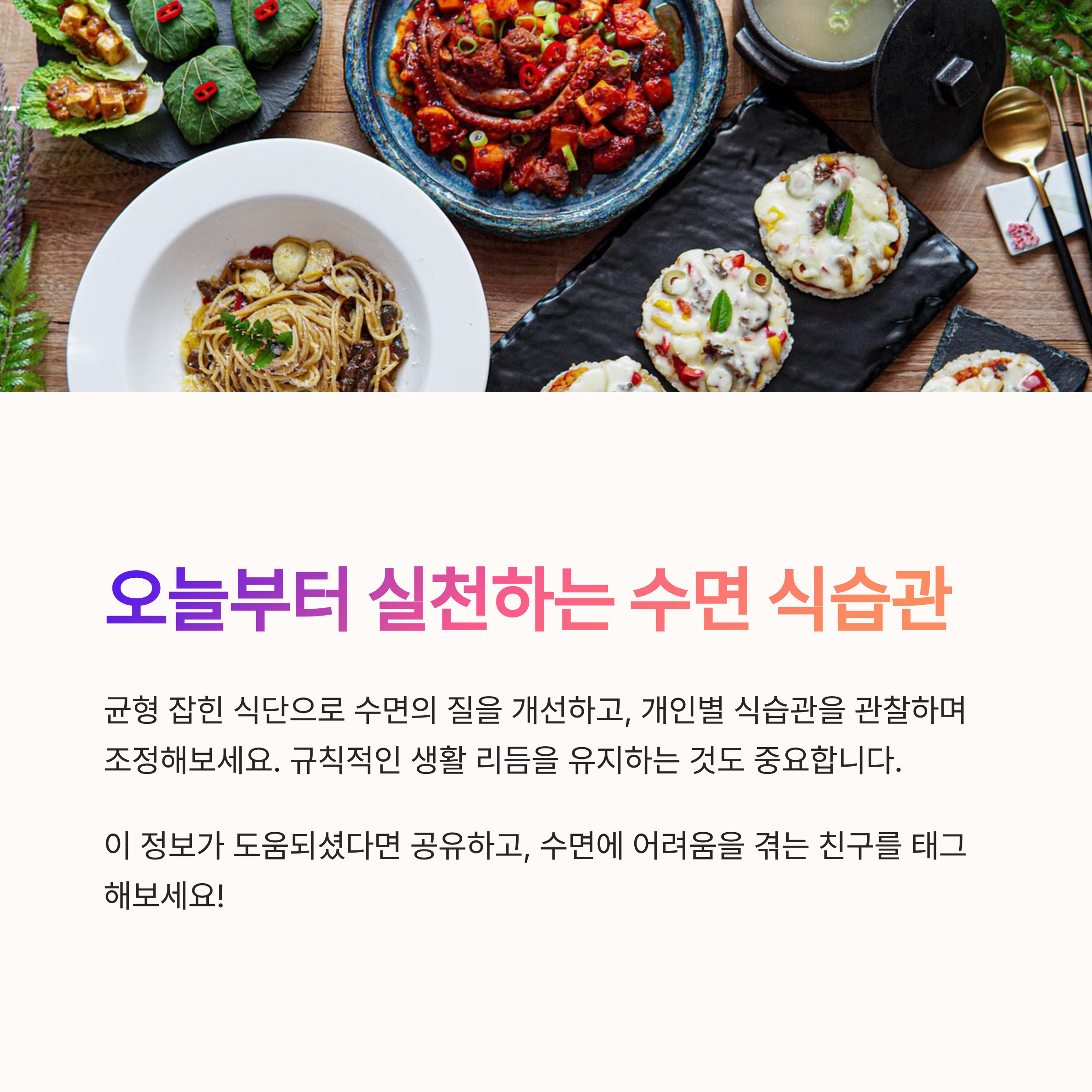 | 자연 성분 위주의 식단이 안정적 수면 유도 | 자극적인 음식은 교감신경을 활성화 | 영양소의 균형 잡힌 섭취가 핵심 |