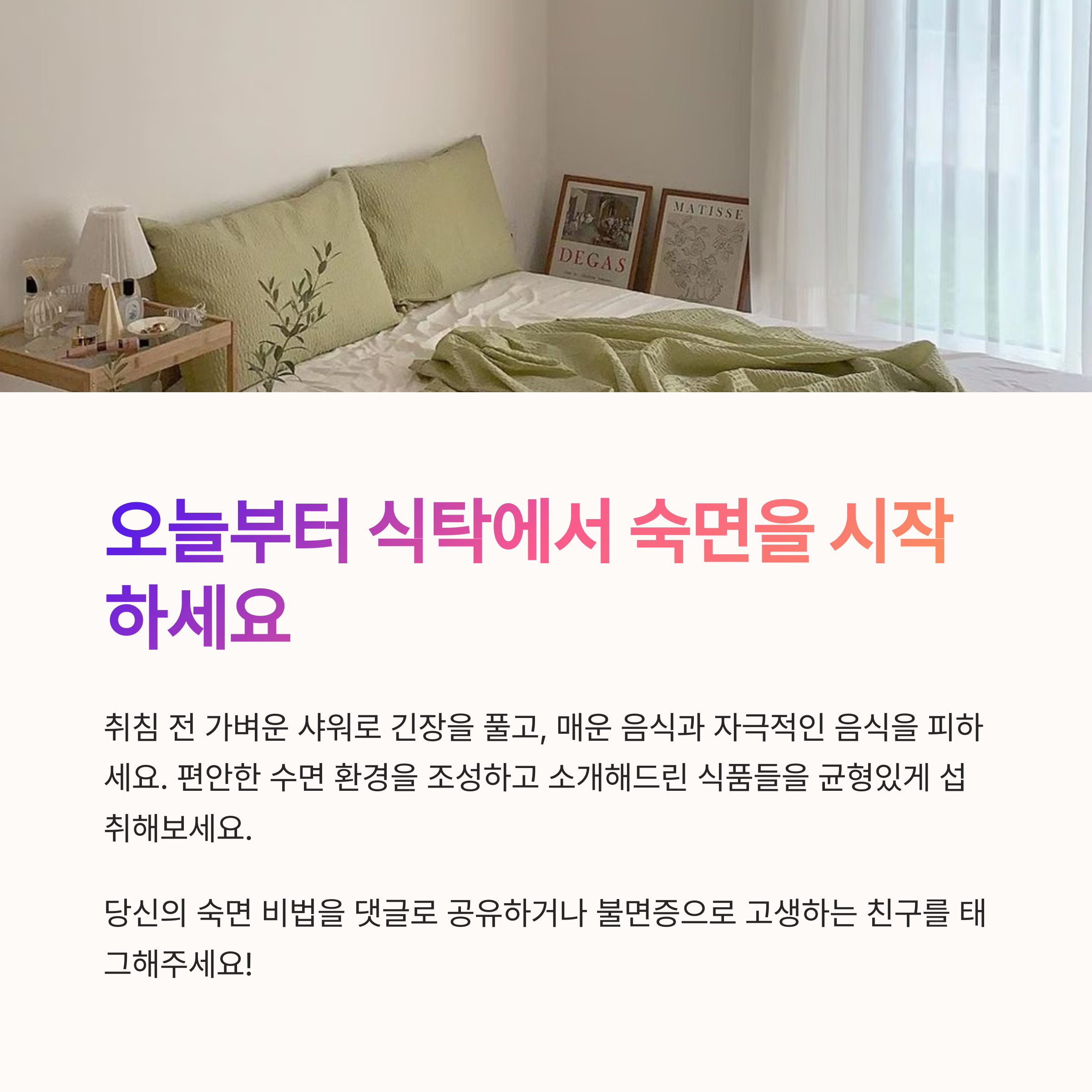 불면증 완화를 위해 어떤 음식을 드시고 계신가요? 효과를 본 사례나 추천하고 싶은 팁이 있다면 댓글로 공유해주세요. 서로의 경험이 소중한 정보가 됩니다.