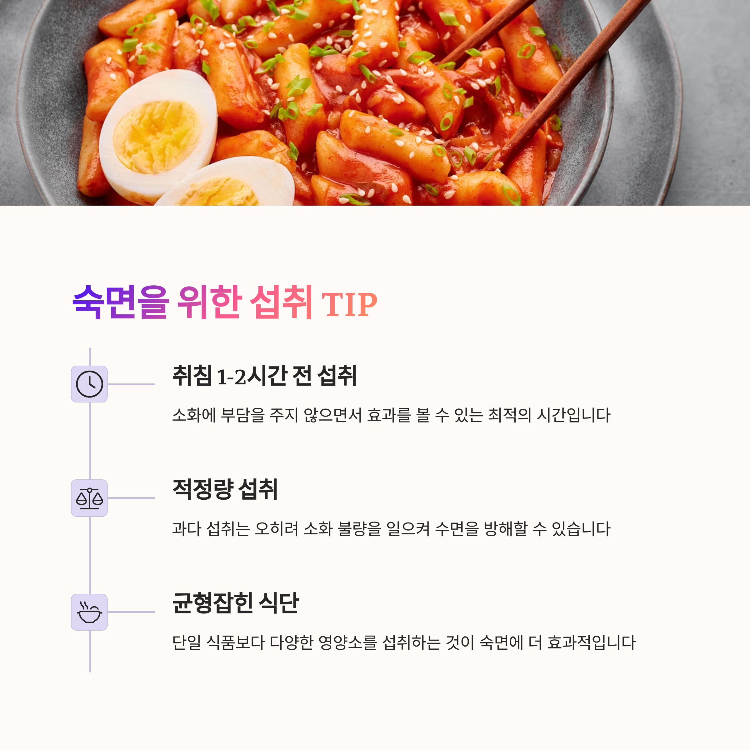 | 과일은 신선하게 섭취하고, 취침 1시간 전이 적기입니다. | 너무 늦은 시간의 식사는 오히려 수면을 방해합니다. | 낮잠은 피하고, 규칙적인 식사와 운동도 중요합니다. |