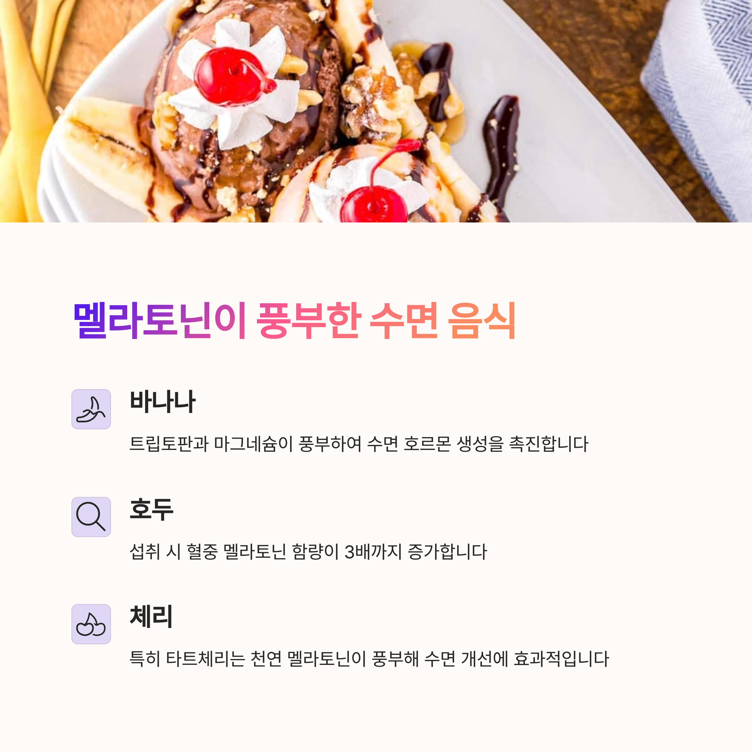| 체리, 바나나, 키위는 멜라토닌을 함유하고 있습니다. | 저녁 식사는 가볍고, 고탄수화물은 피하는 것이 좋습니다. | 햇볕을 충분히 쬐고, 일정한 취침 시간 유지가 중요합니다. |