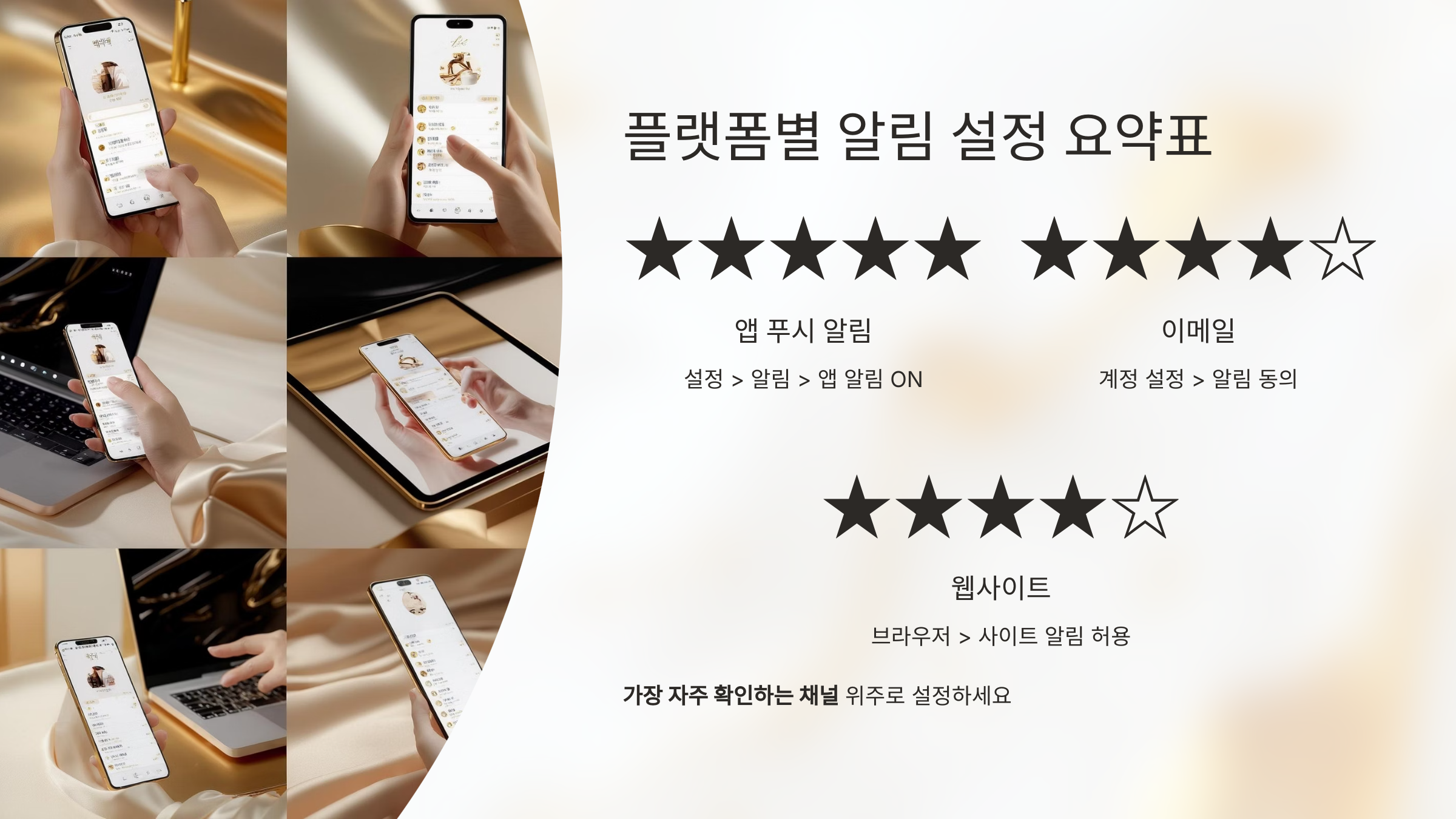 모바일 앱, 웹사이트, 이메일 등 다양한 채널을 통해 알림을 받는 방법을