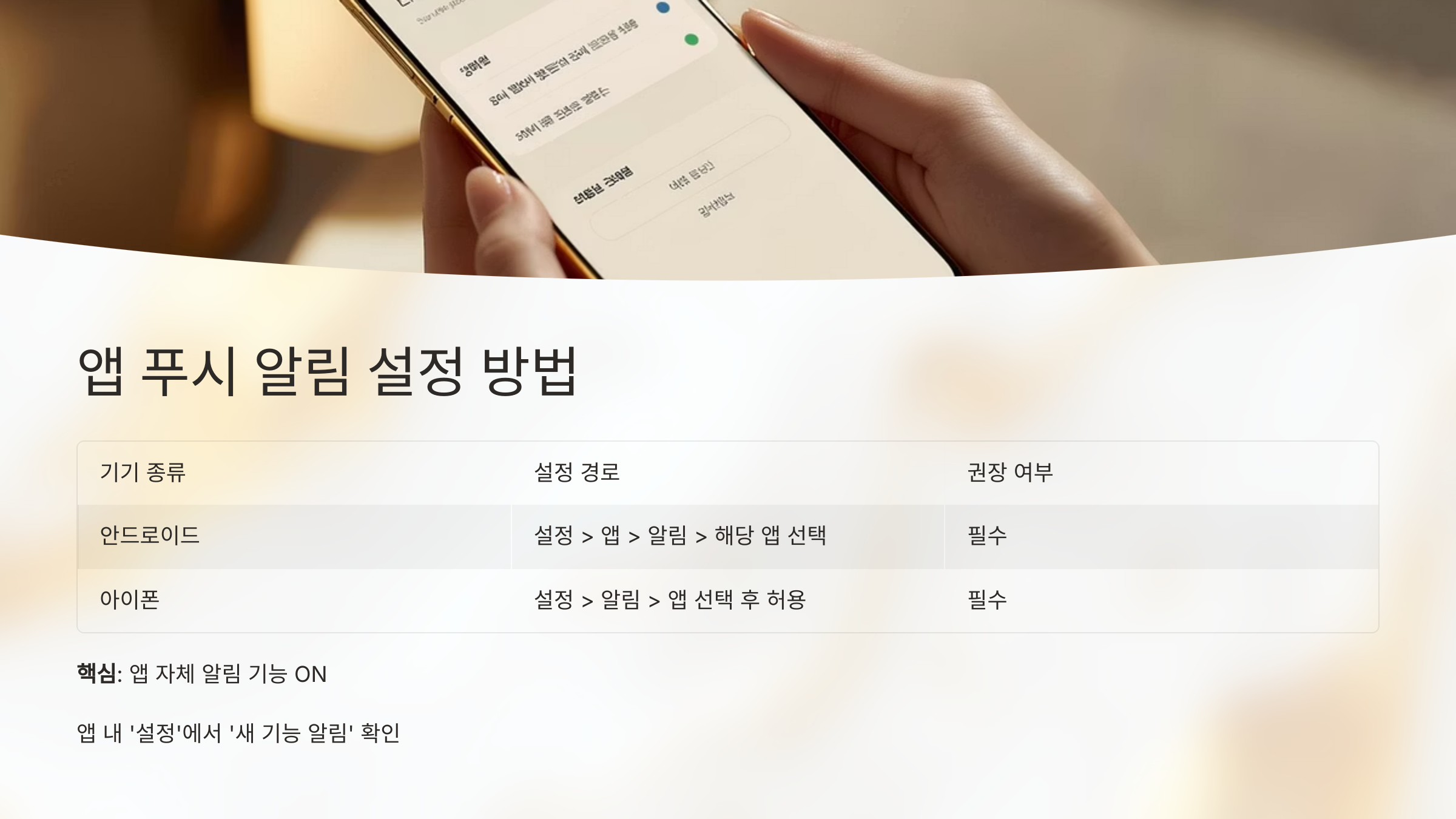| 앱 | 설정 > 알림 > 앱 알림 ON | 푸시 알림 | ★★★★★ |