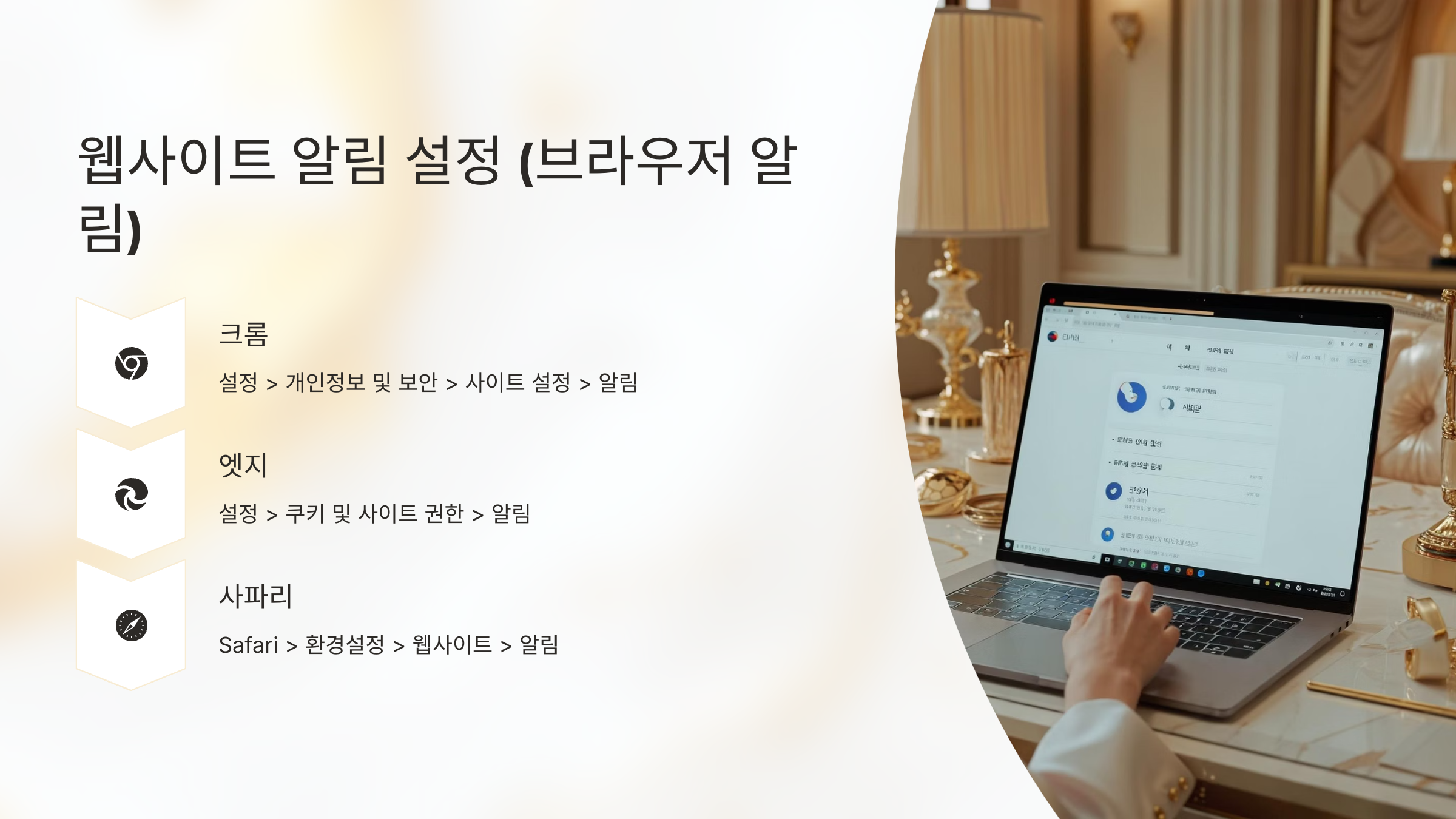 | 웹사이트 | 브라우저 > 사이트 알림 허용 | 웹 푸시 | ★★★★☆ |