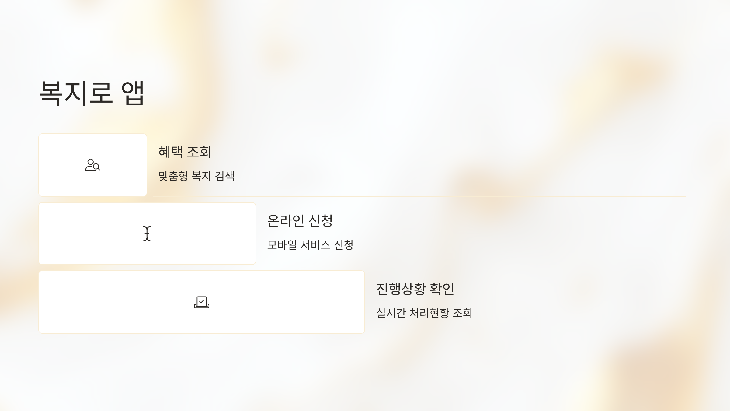 자신에게 해당하는 복지 서비스를 쉽게 찾고 신청까지 가능합니다.