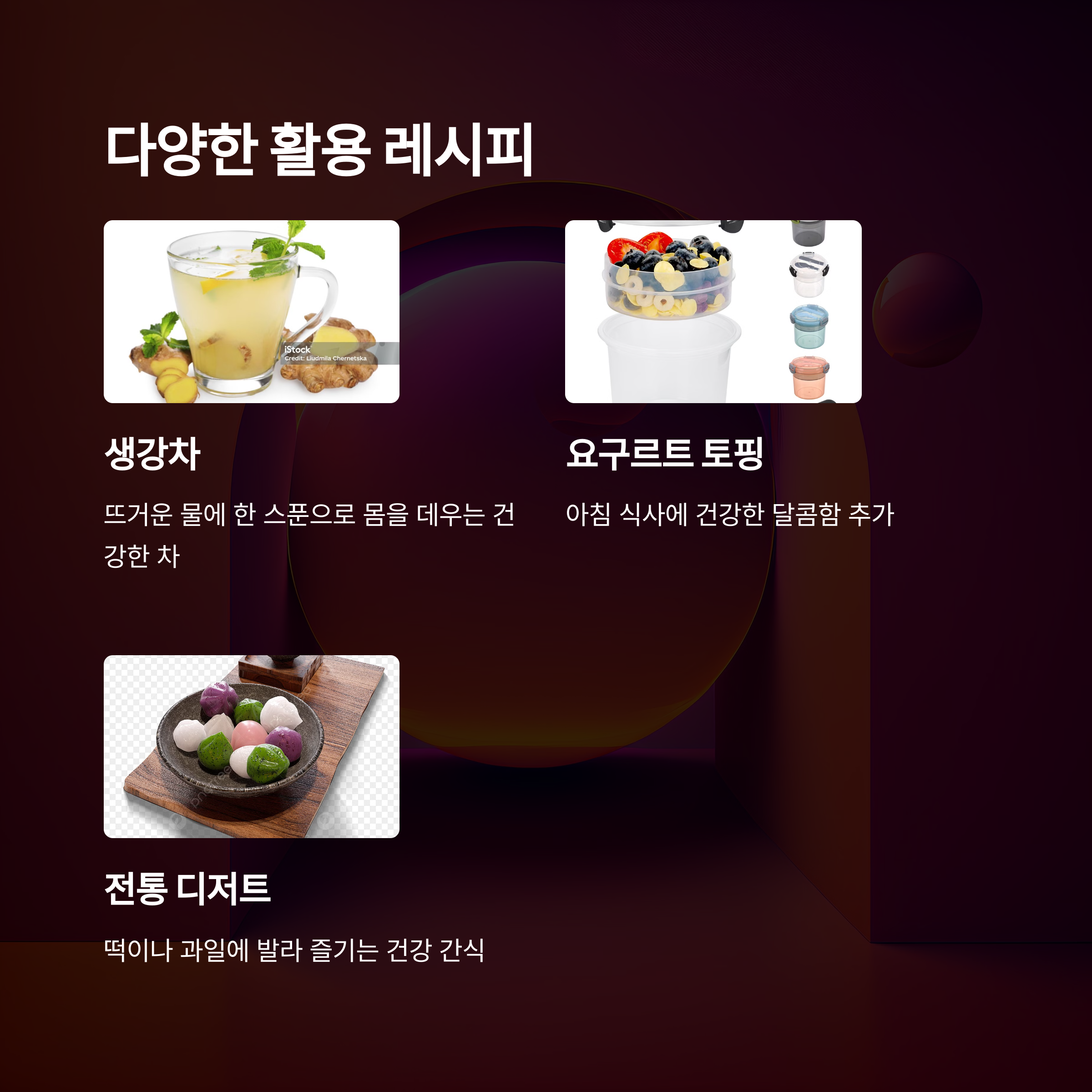 | 떡, 토스트, 차 등 활용도 높은 천연 감미료 | 감기 예방에 도움을 주는 면역력 간식 | 일상 속에서 쉽게 챙길 수 있는 건강 식품 |
