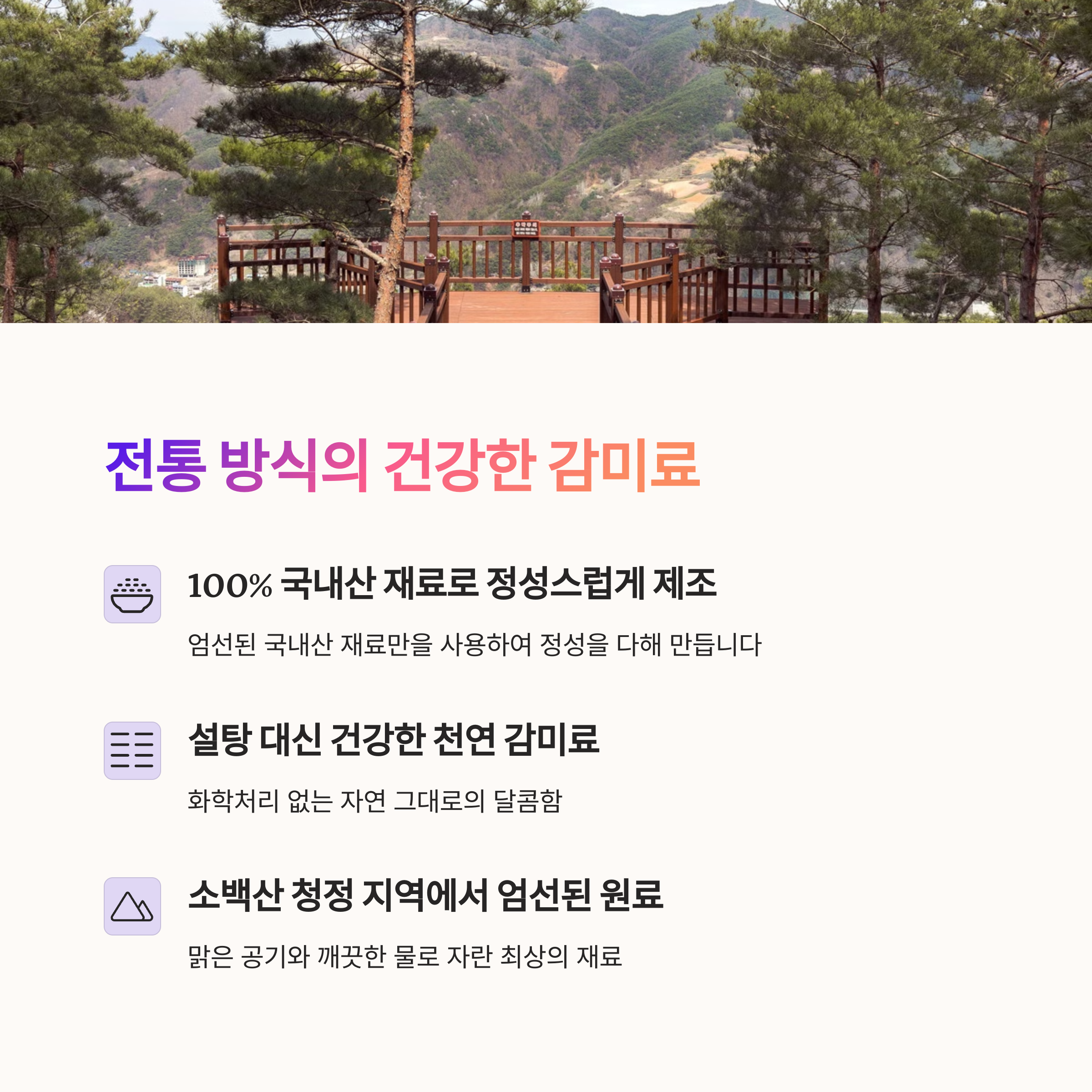 | 전통 방식으로 만든 깊은 맛의 조청 | 생강의 건강함이 더해진 따뜻한 단맛 | 남녀노소 모두 즐길 수 있는 영양 간식 |