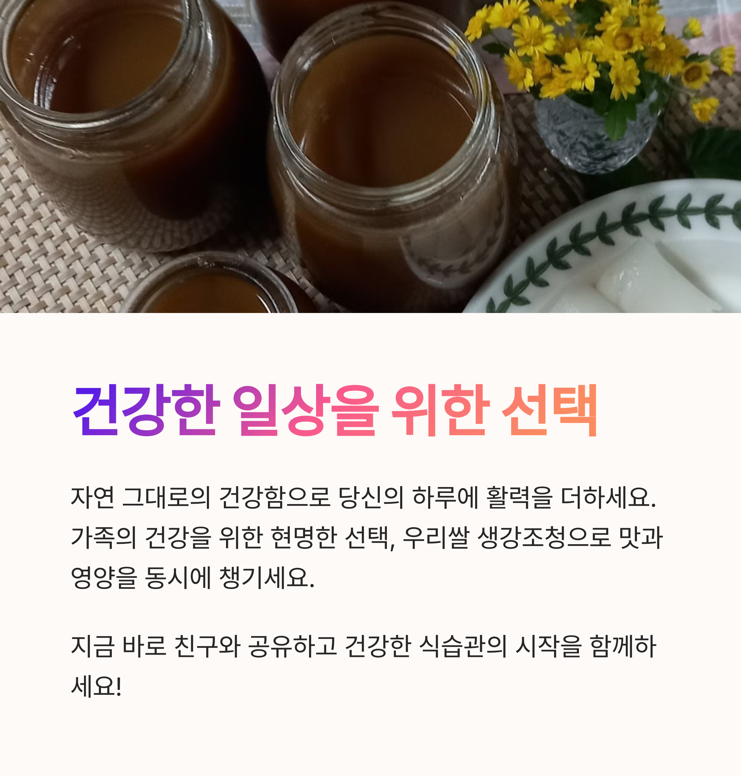 | 우리쌀 조청 | 전통방식으로 만든 깊고 부드러운 단맛 |