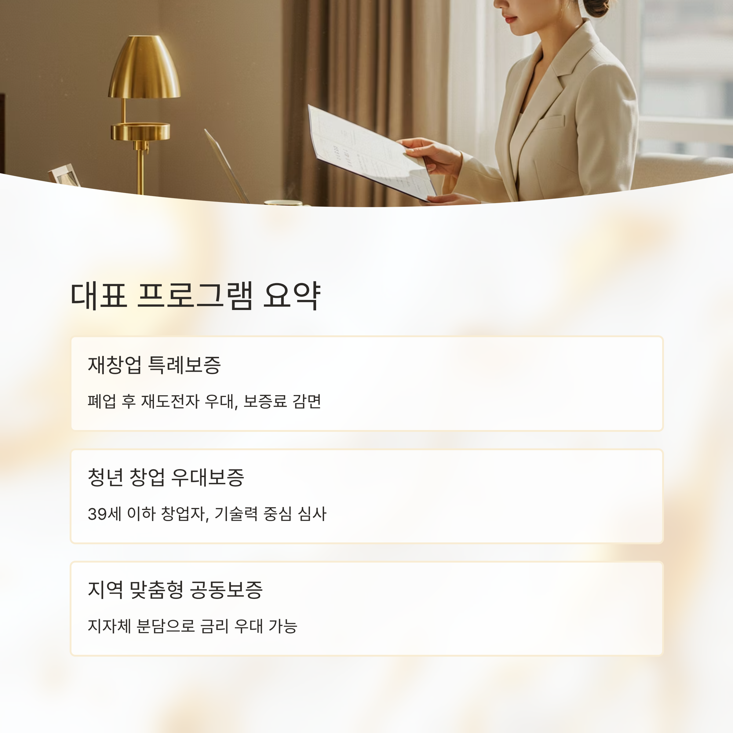 | 재창업 특례보증 | 신보/기보 | 폐업 후 재도전자 우대, 보증료 감면 적용 |