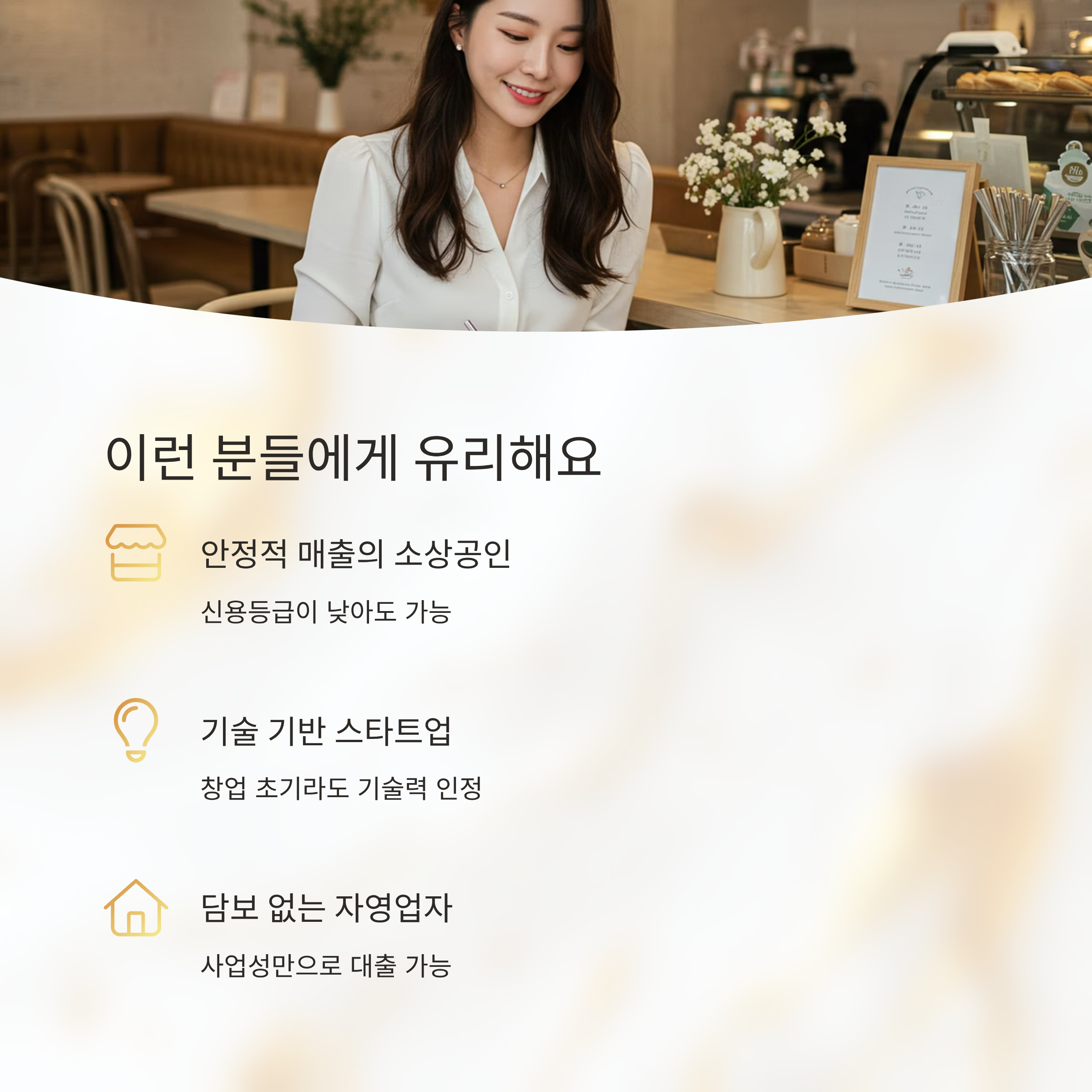 | 보증 대상 | 일반 소상공인, 중소기업 | 기술력 보유 기업, 창업·벤처기업 등 |