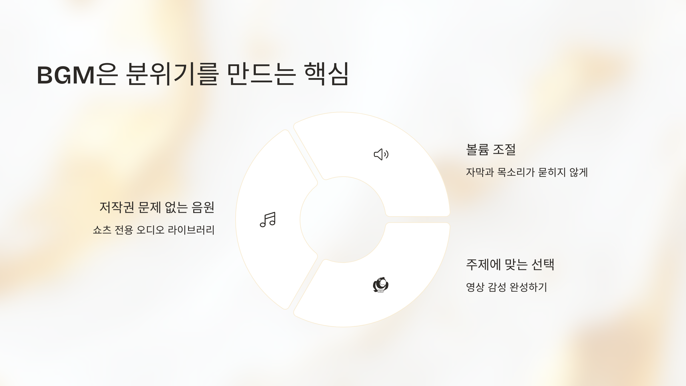 볼륨을 줄여 자막과 목소리가 묻히지 않도록 조절하는 것이 중요합니다.