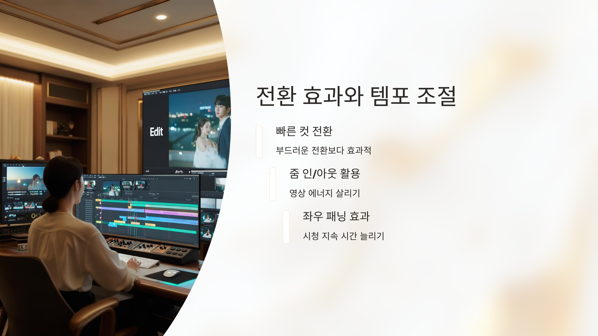 화면이 지루하지 않도록 중간에 줌 인/아웃, 좌우 패닝 효과를 넣으면