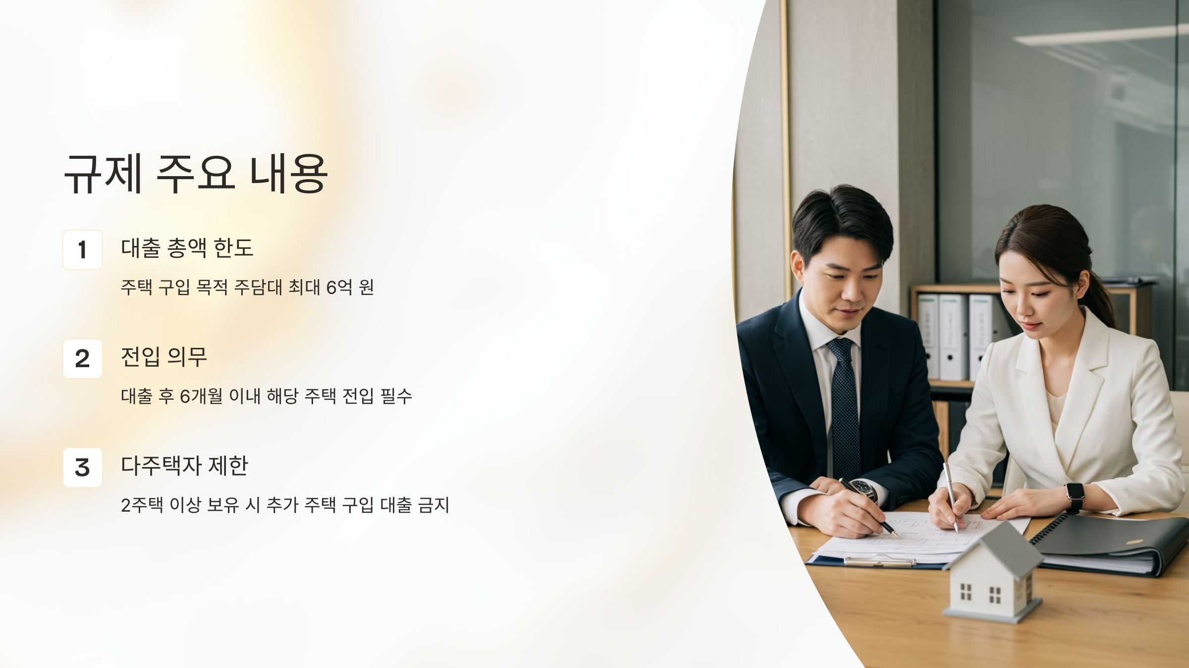| 다주택자 대출 | 2주택 이상 보유 시 추가 주택 구입 목적 대출 금지 | 수도권 전역 및 규제지역 |