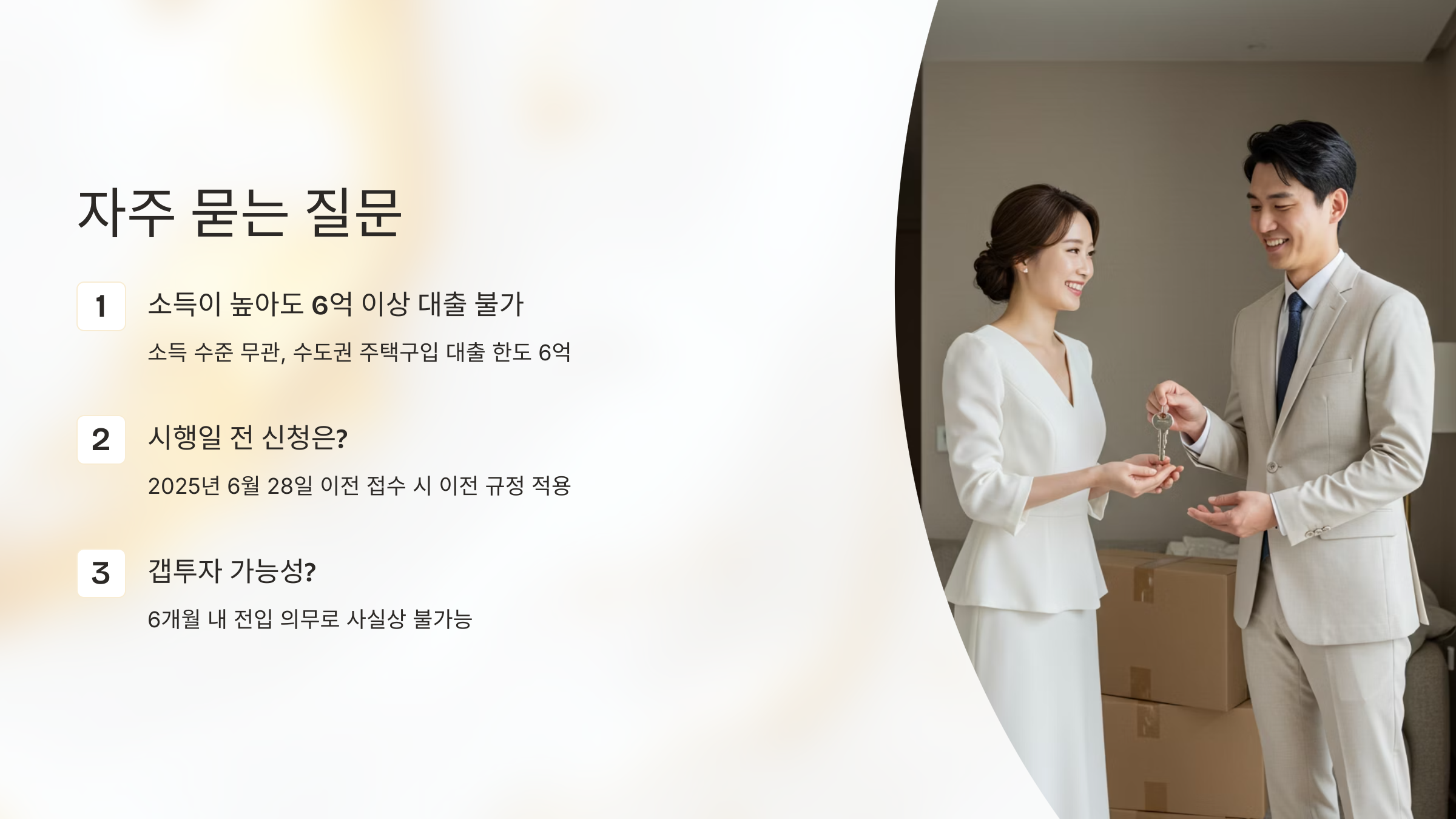 정부가 최근 급증하는 가계부채와 부동산 시장 과열을 잡기 위해 강력한 카드를 꺼내 들었습니다. 바로 2025년 6월 28일부터 수도권과 규제지역에서 주택을 구입할 때 주택담보대출 한도를 최대 6억 원으로 제한하는 것입니다. 이전에는 개인의 소득(DSR)이나 주택 가격(LTV)에 따라 대출 한도가 정해졌지만, 이제는 소득이 아무리 높아도, 집값이 비싸도 최대 6억 원까지만 빌릴 수 있게 된 거죠. 이건 정말 전례 없는 강력한 조치라고 할 수 있어요.