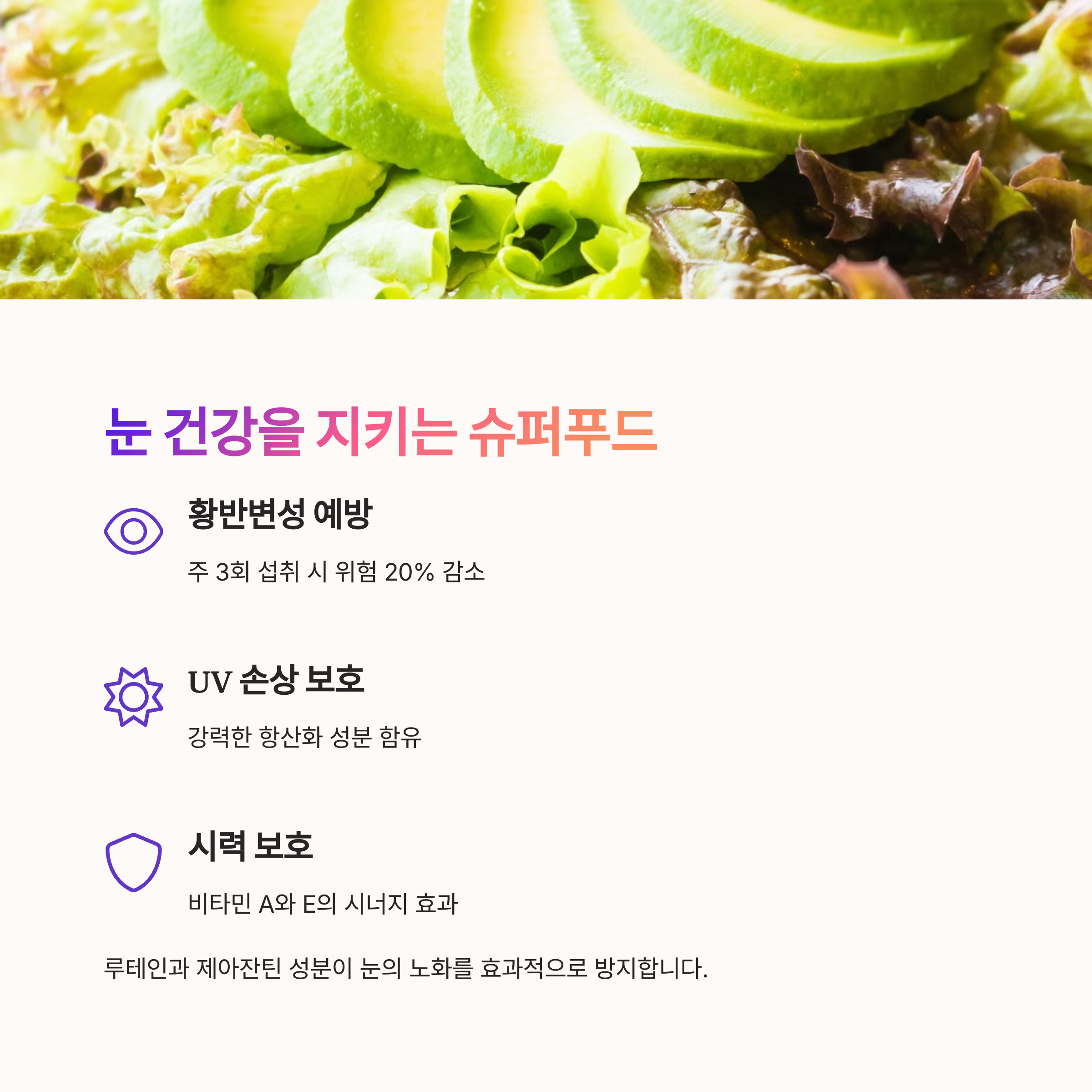 아보카도는 요리의 다양성과 건강 기능성 두 마리 토끼를 모두 잡을 수 있는 식품입니다. 샐러드, 토스트, 과카몰리, 샌드위치 등 다양한 레시피에 자연스럽게 녹아들며, 루테인과 제아잔틴 성분을 포함해 눈 건강에도 긍정적인 영향을 줍니다. 특히 노화로 인한 황반변성 예방에 도움을 줄 수 있어 중장년층에게도 매우 유익하답니다. 매일 꾸준히 섭취하면, 몸 속에서 천천히 건강 변화를 경험할 수 있는 귀한 과일이에요.
