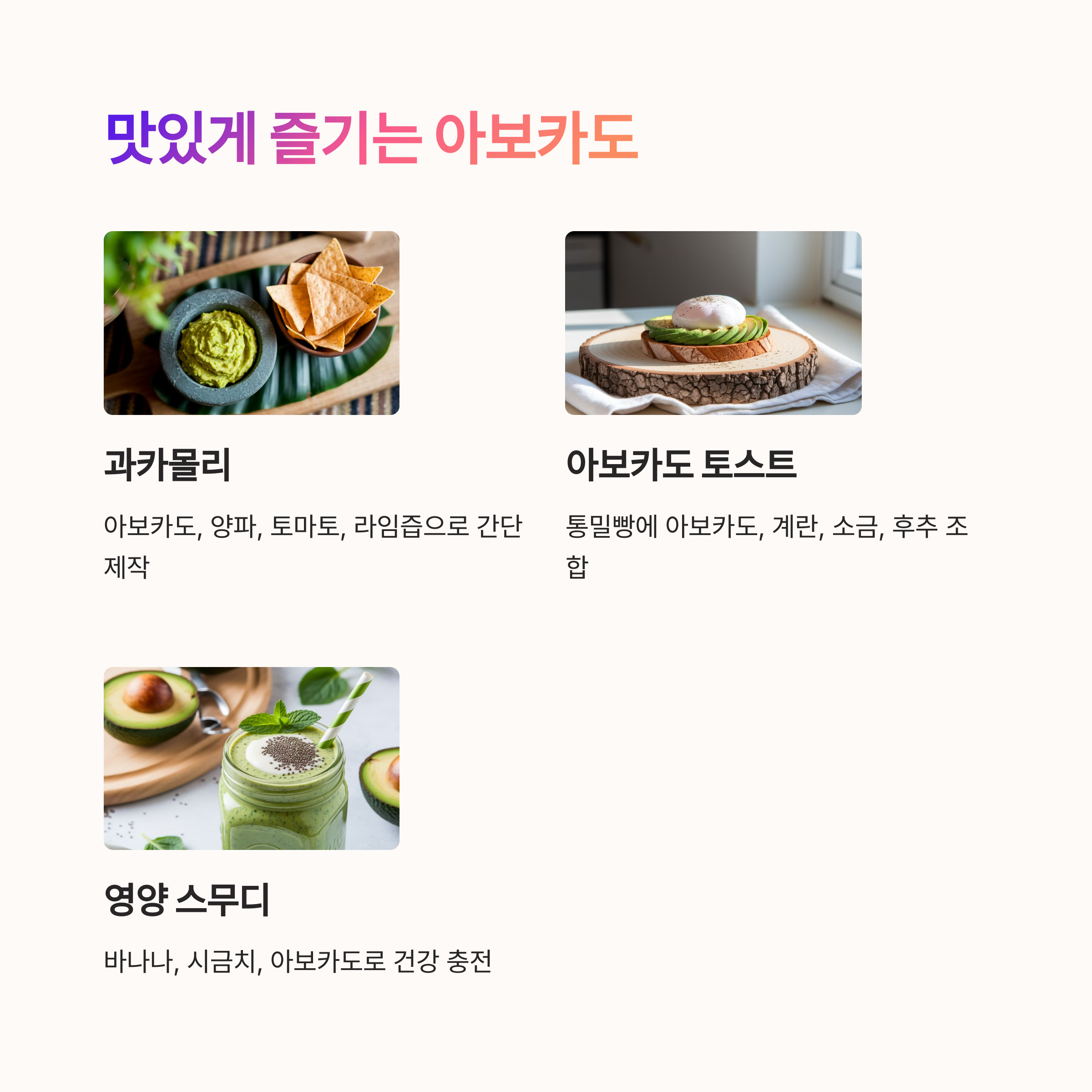 | 비타민 K, C, E, B군, 칼륨 등이 풍부 | 포만감 유지와 지방 흡수 억제로 도움 | 샐러드, 과카몰리, 샌드위치, 토스트 등 |