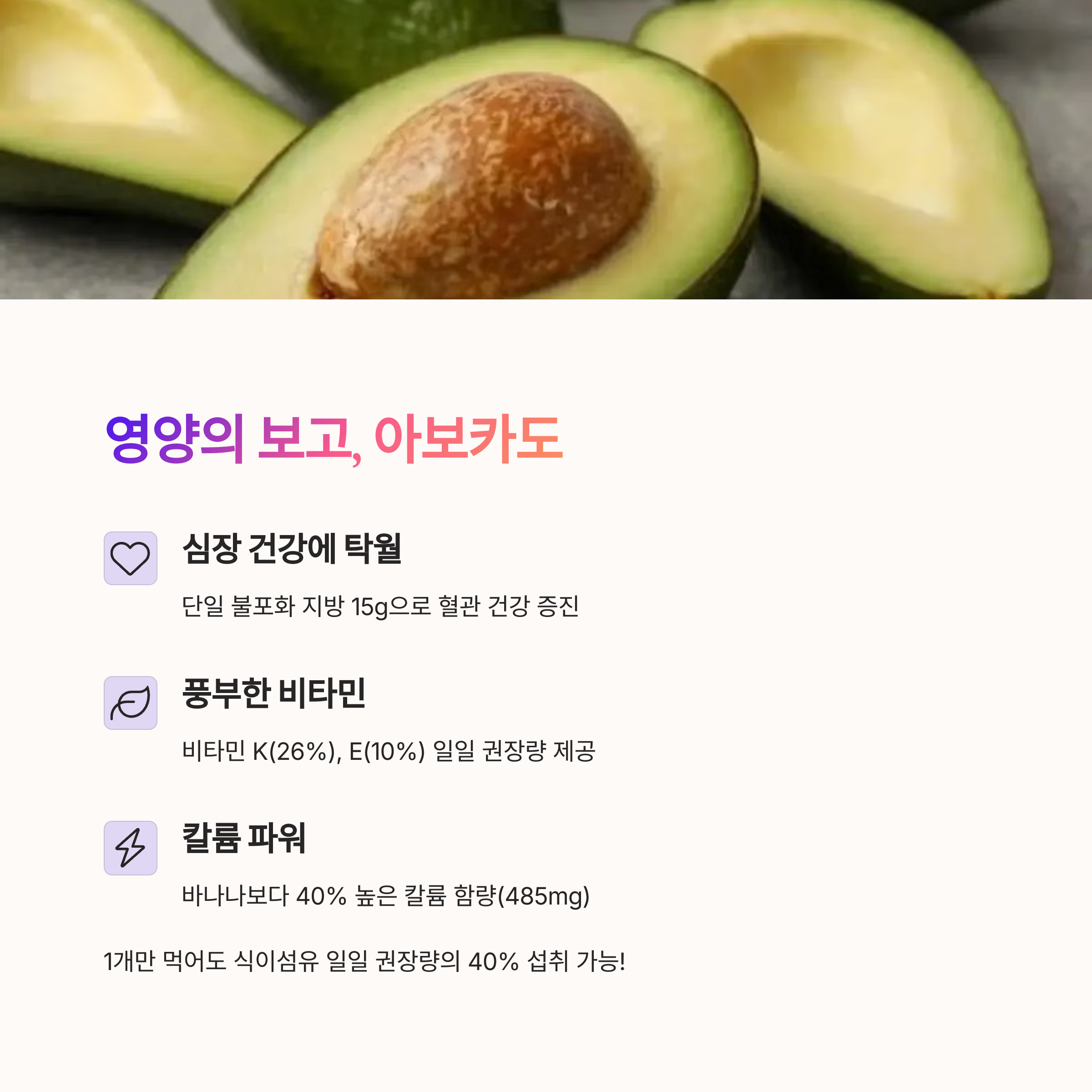 | 아보카도 영양소 | 비타민과 건강한 지방, 섬유질이 풍부해요 |