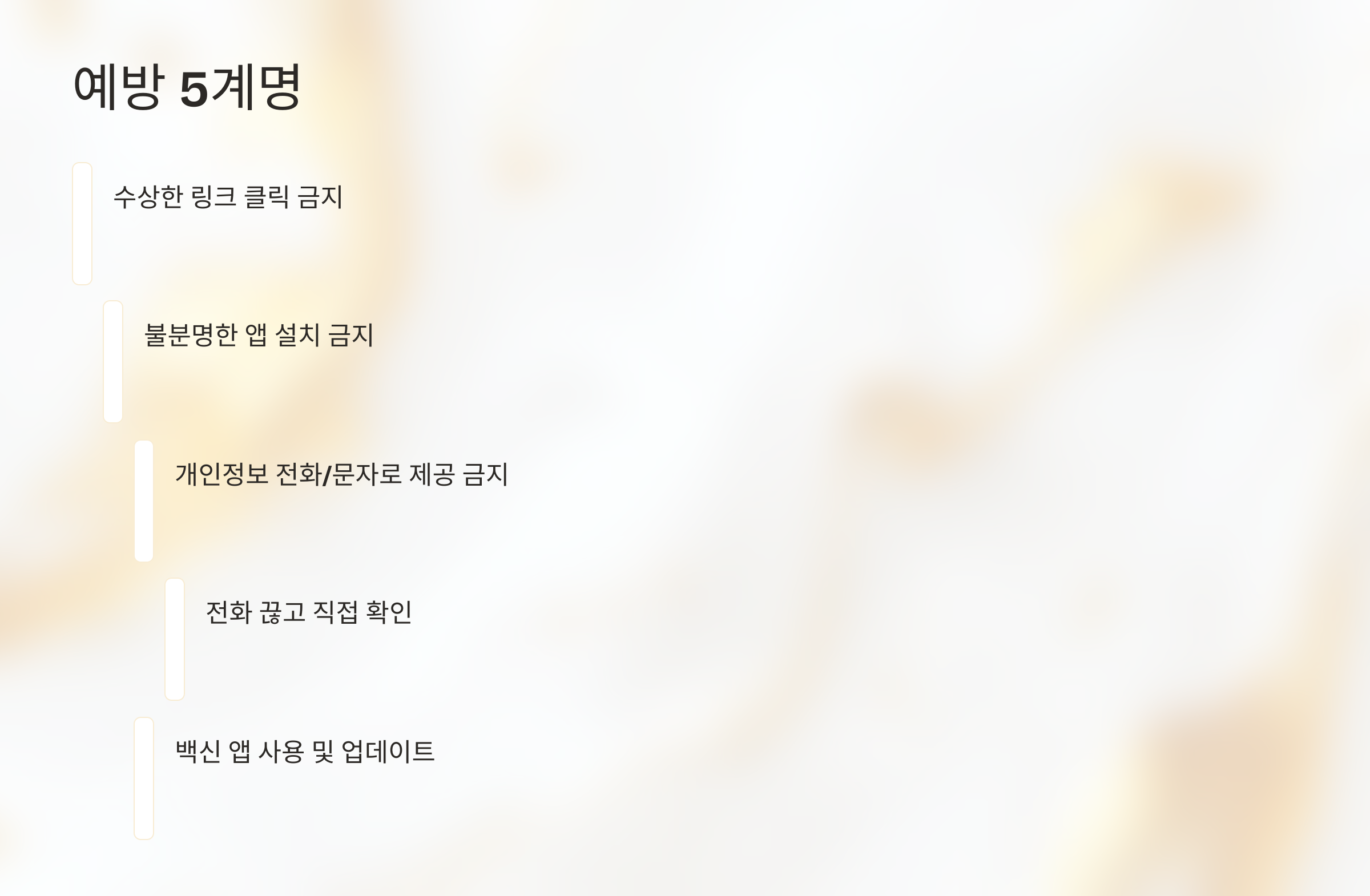 - 수상한 문자/링크 절대 클릭 금지! : 모르는 번호나 이상한 내용의 문자 메시지에 포함된 인터넷 주소(URL)는 절대 누르지 마세요. 특히 '.apk' 파일은 무조건 의심해야 해요.