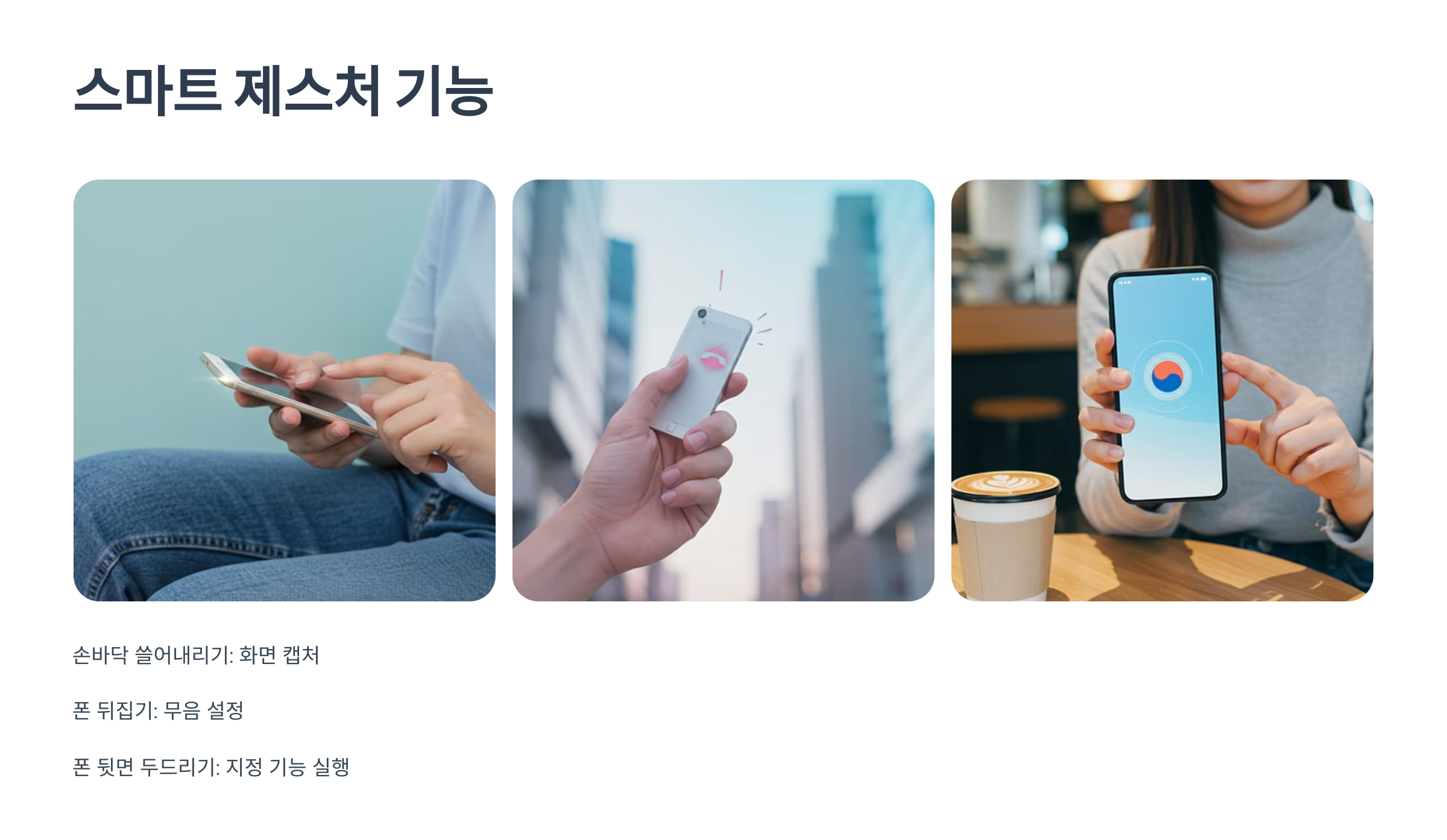 화면을 아래로 손바닥으로 쓸면 캡처, 귀에 대면 자동 통화 연결, 폰 뒤집으면 무음 설정이 가능합니다.