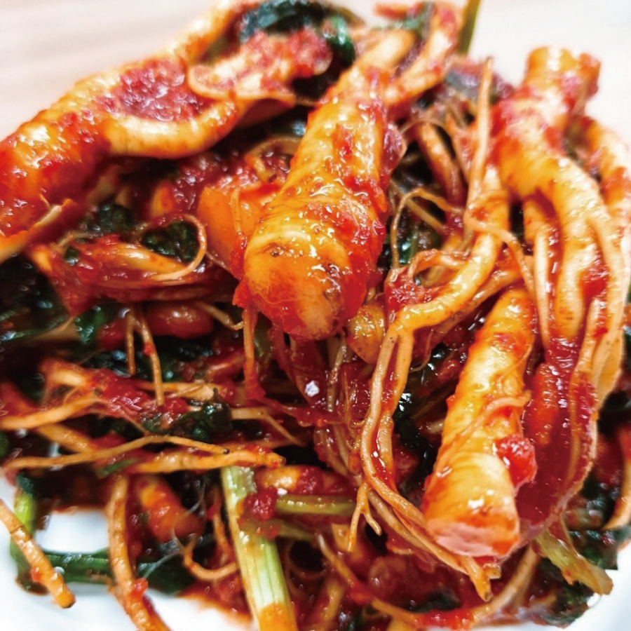 고들빼기김치가 밥도둑이라면, 산고들빼기 두루치기는 술도둑! 매콤한 양념에 볶은 돼지고기와 쌉쌀한 산고들빼기의 조합은 느끼함을 잡아주며 끝없이 손이 가게 만듭니다. 신선한 산고들빼기를 듬뿍 넣어 함께 볶아주세요.