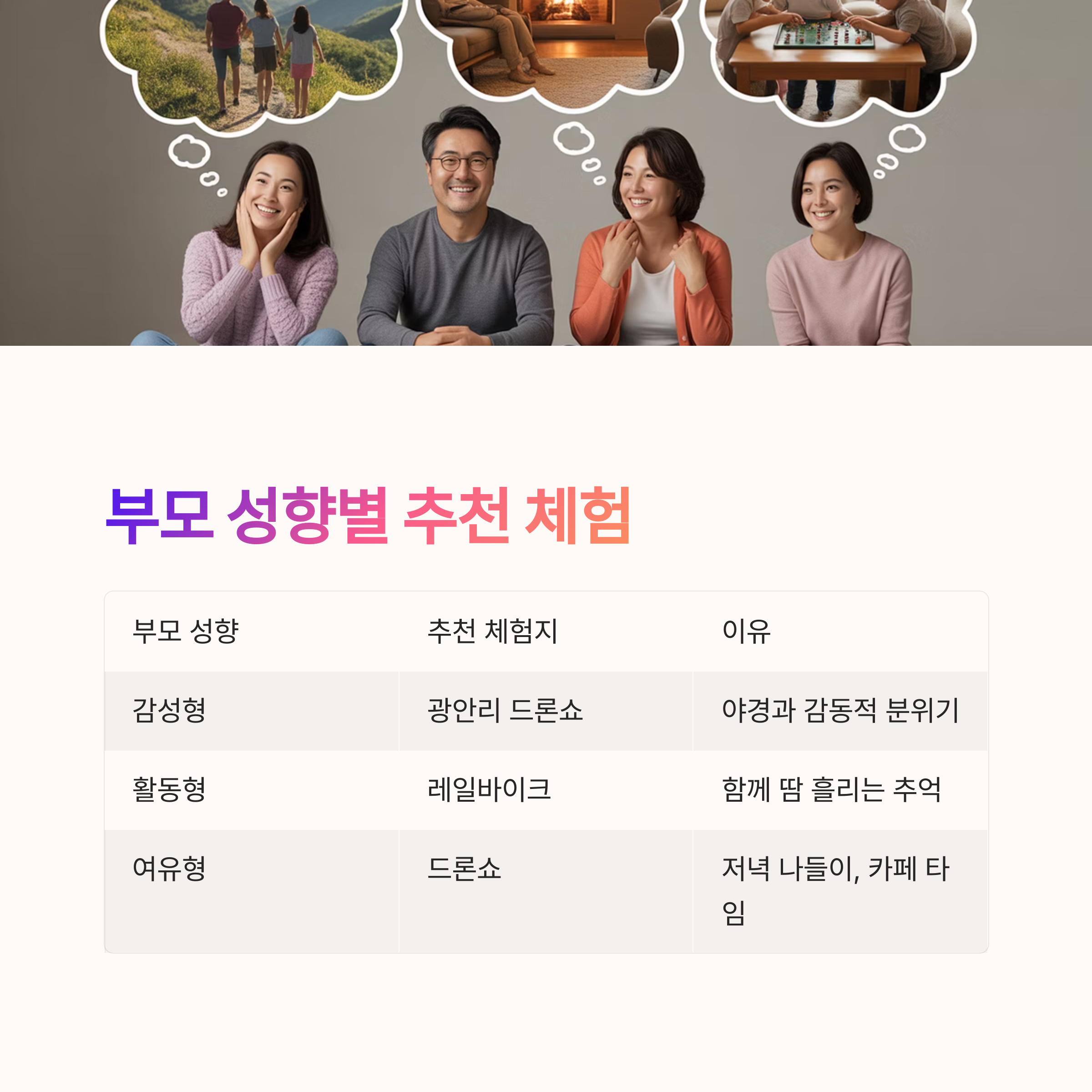 | 여유형 | 드론쇼 | 늦은 저녁 나들이, 카페 타임 가능 |