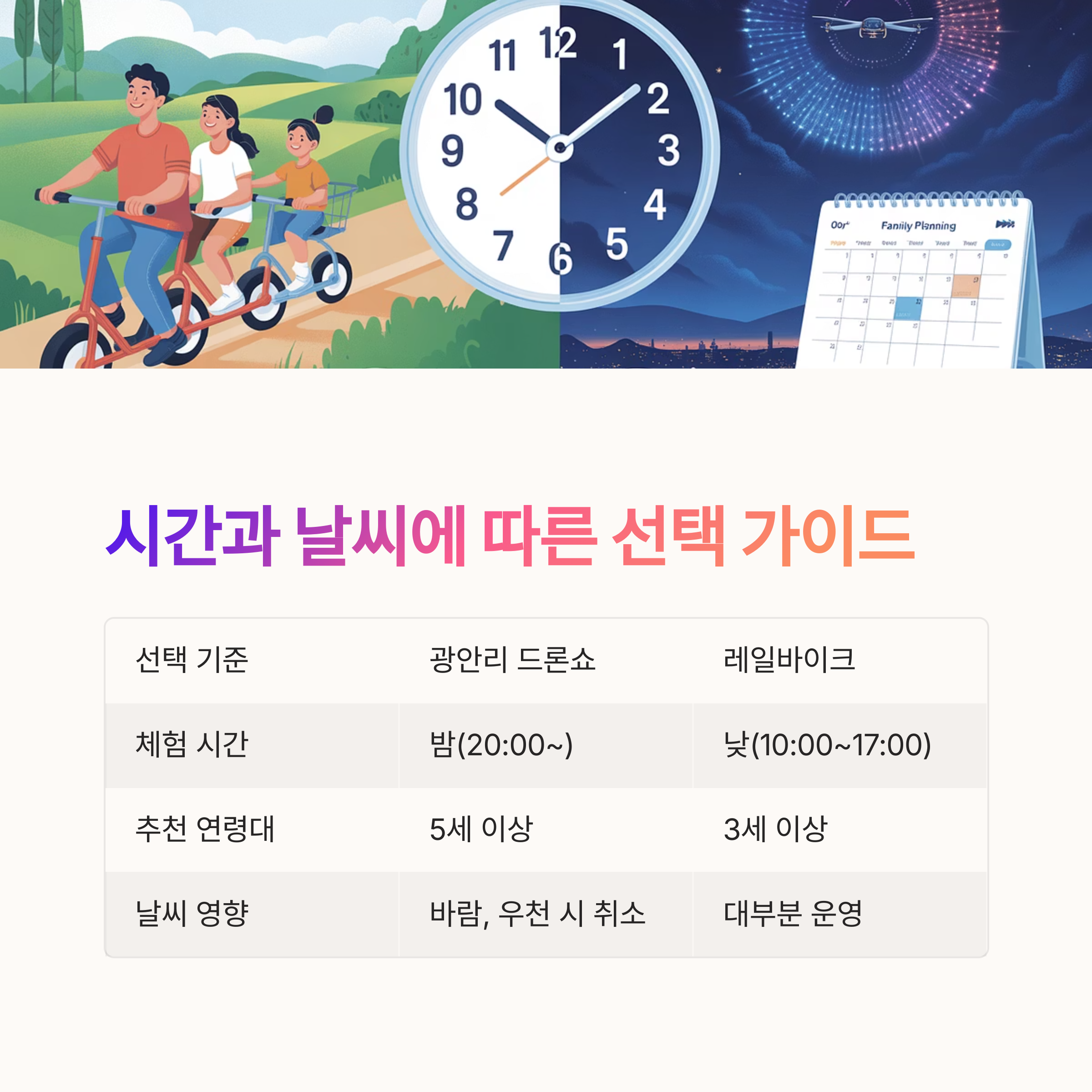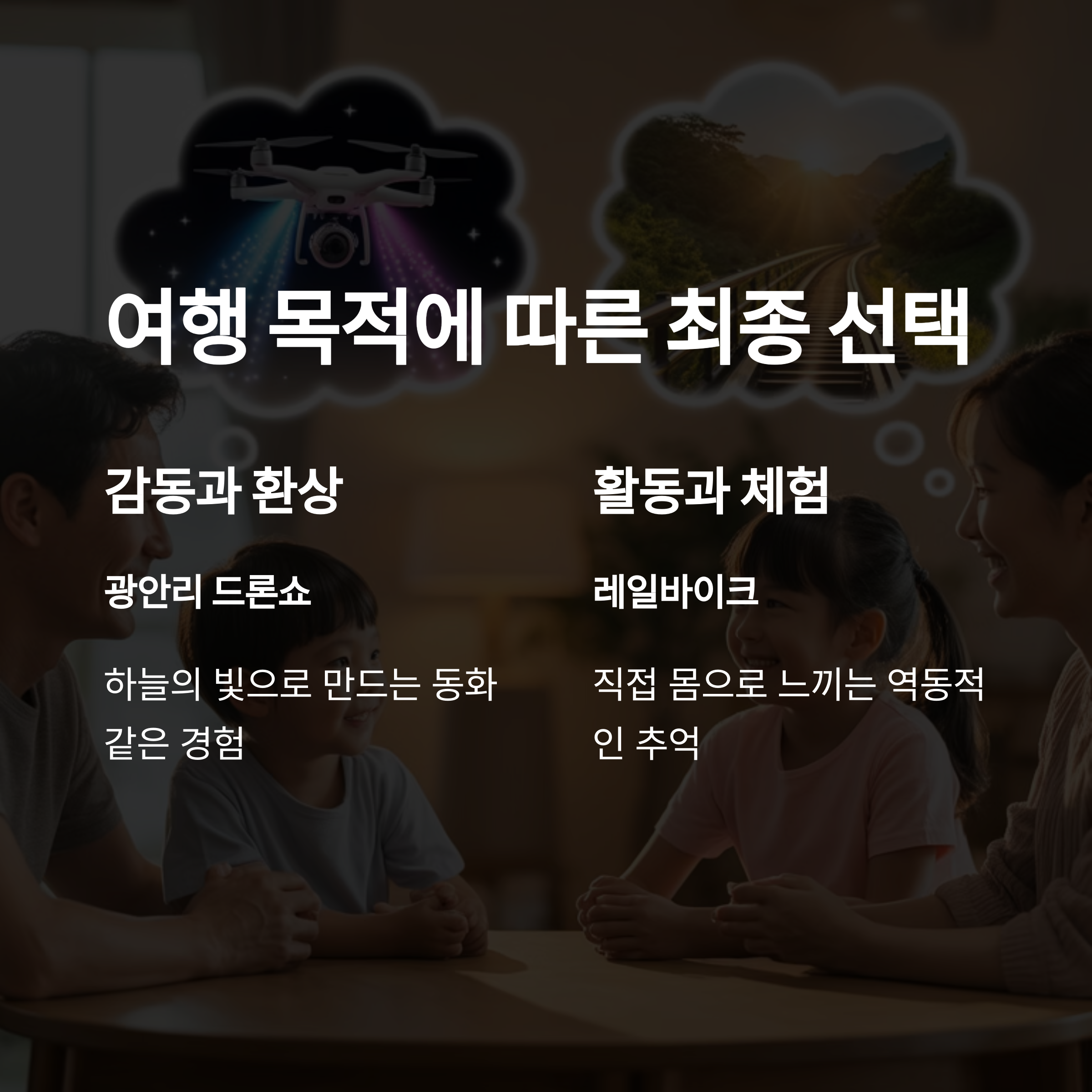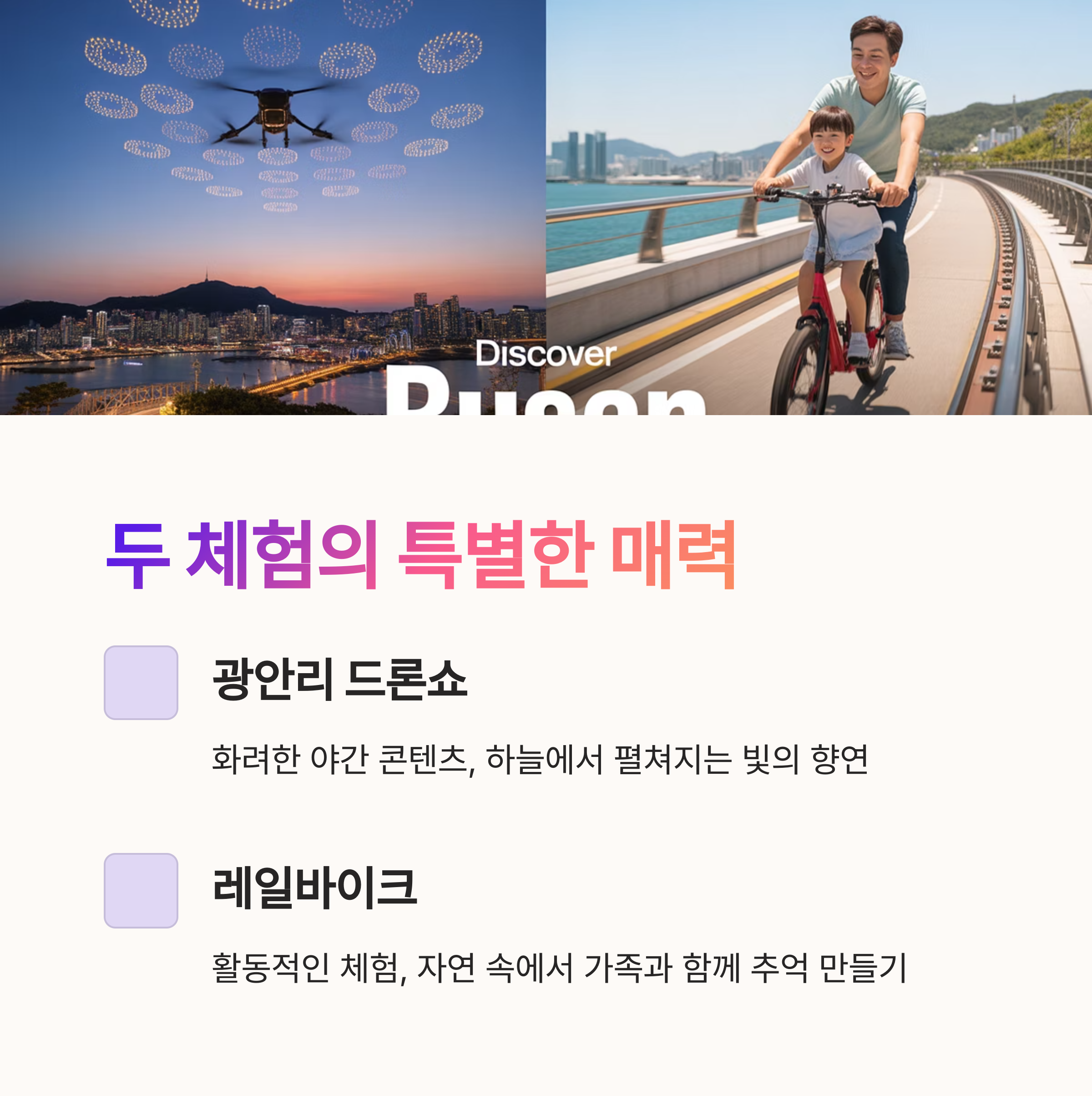 광안리 드론쇼와 레일바이크 중 어떤 선택이 더 좋을지 고민되실 겁니다.