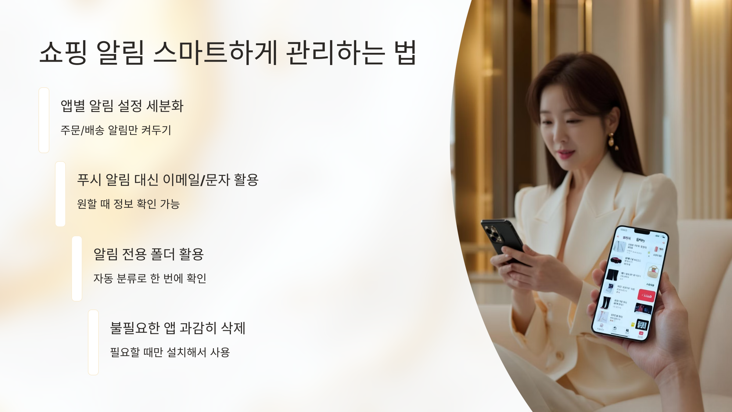 - 쇼핑 알림은 스마트하게! 앱 설정 세분화, 이메일/문자 활용, 불필요한 앱 삭제로 관리하세요.