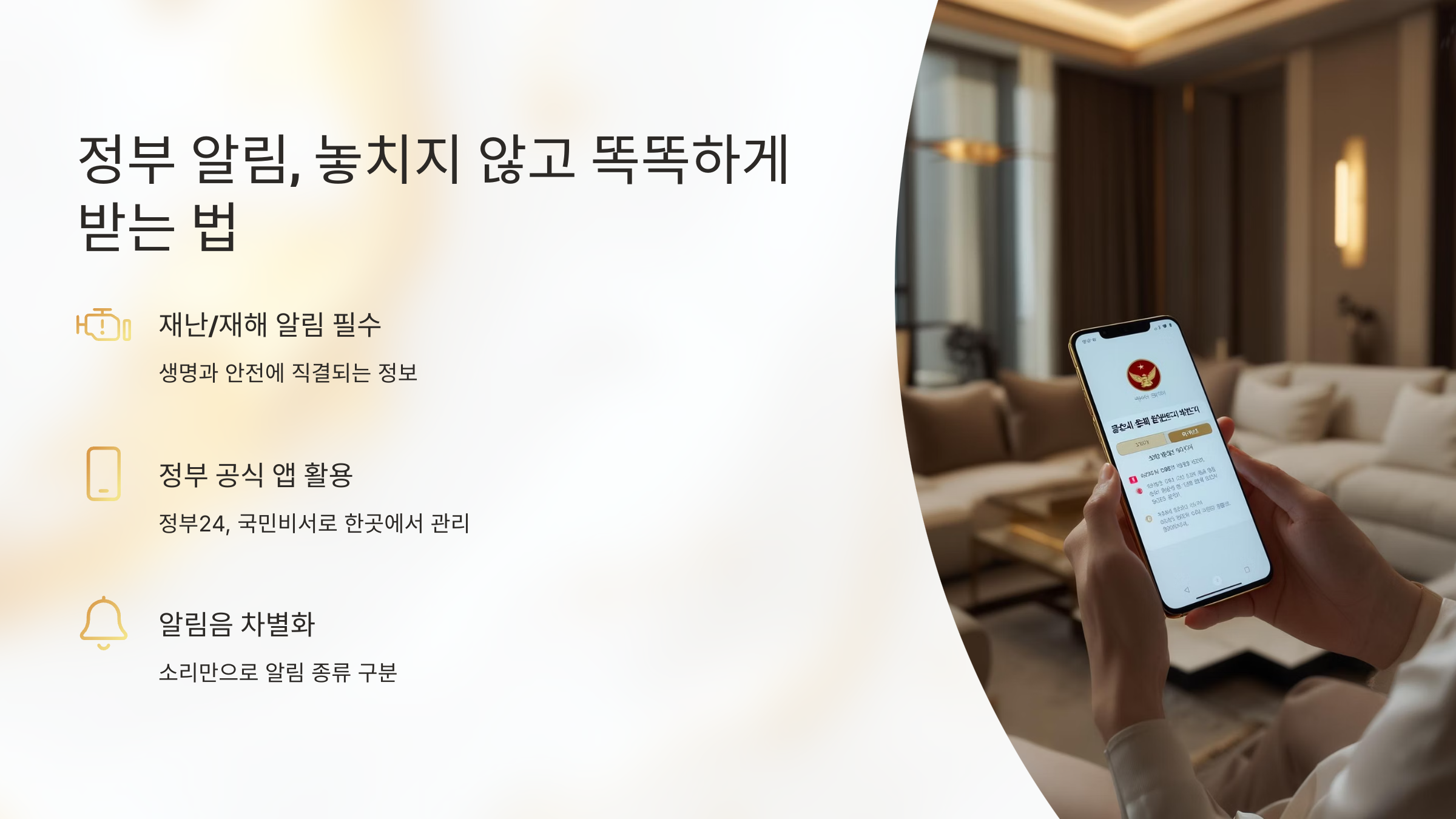 - 정부 알림은 놓치지 않게! 정부 공식 앱 활용, 알림음/진동 차별화, 방해금지 모드 예외 설정으로 관리하는 것이 좋아요.