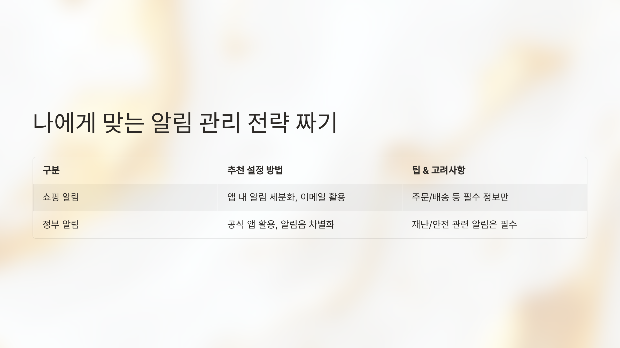 알림 관리의 핵심은 '나에게 맞는' 전략을 세우는 거예요. 아래 표를 보면서 나만의 계획을 세워보세요!