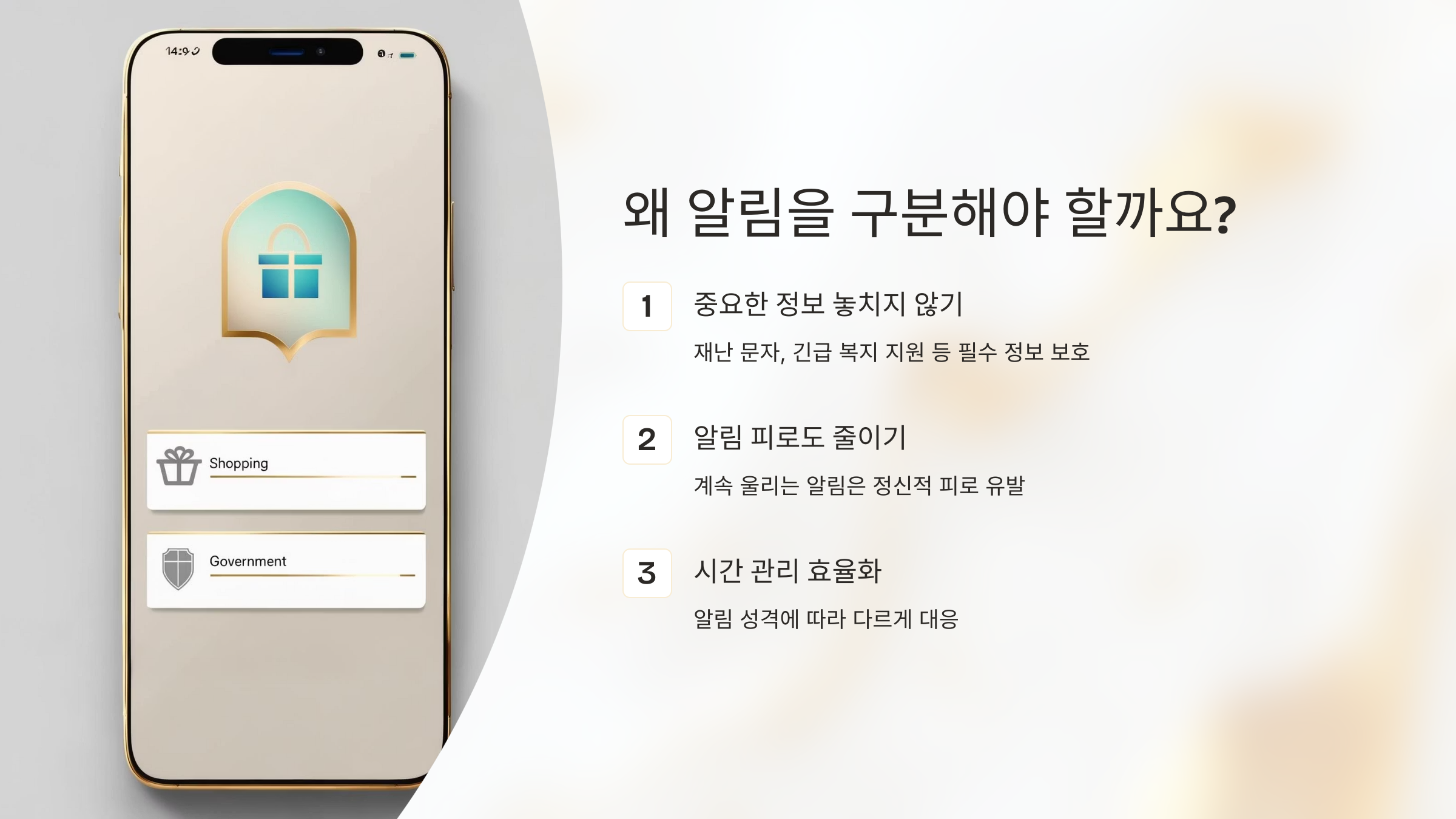 - ✨ 중요한 정보를 놓치지 않기 위해: 정부 알림은 재난 문자, 긴급 복지 지원, 백신 접종 안내 등 생활에 꼭 필요한 중요한 정보들이 많아요. 쇼핑 알림에 섞여 있으면 이런 필수적인 정보를 놓칠 수 있겠죠?