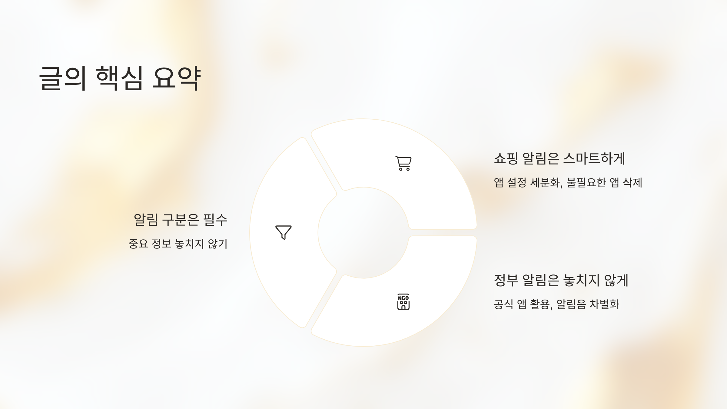 - 알림 구분은 필수: 중요한 정보는 놓치지 않고, 알림 피로도를 줄여 삶의 질을 높일 수 있어요.
