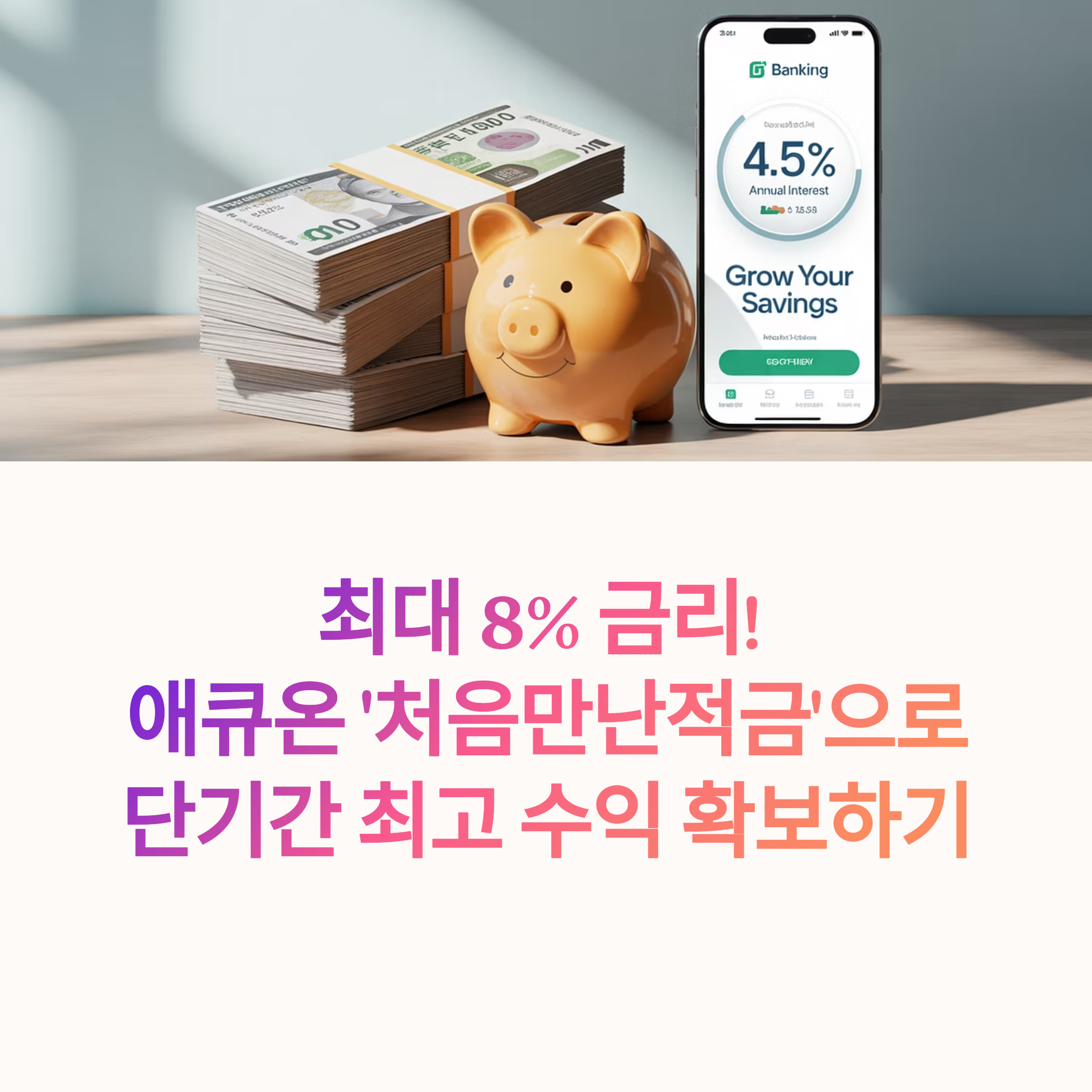 애큐온의 ‘처음만난적금’은 최대 8%라는 고금리가 매력적인 상품이지만, 실제 수익률은 조건 충족 여부에 따라 달라질 수 있습니다. 가입 전에는 기본금리와 우대조건, 중도해지 시 불이익까지 꼭 확인하세요. 단기간 자금을 묶을 수 있는 분들에게는 좋은 선택이 될 수 있지만, 조건을 놓치면 기대보다 낮은 이자를 받을 수 있으니 신중한 판단이 필요합니다.