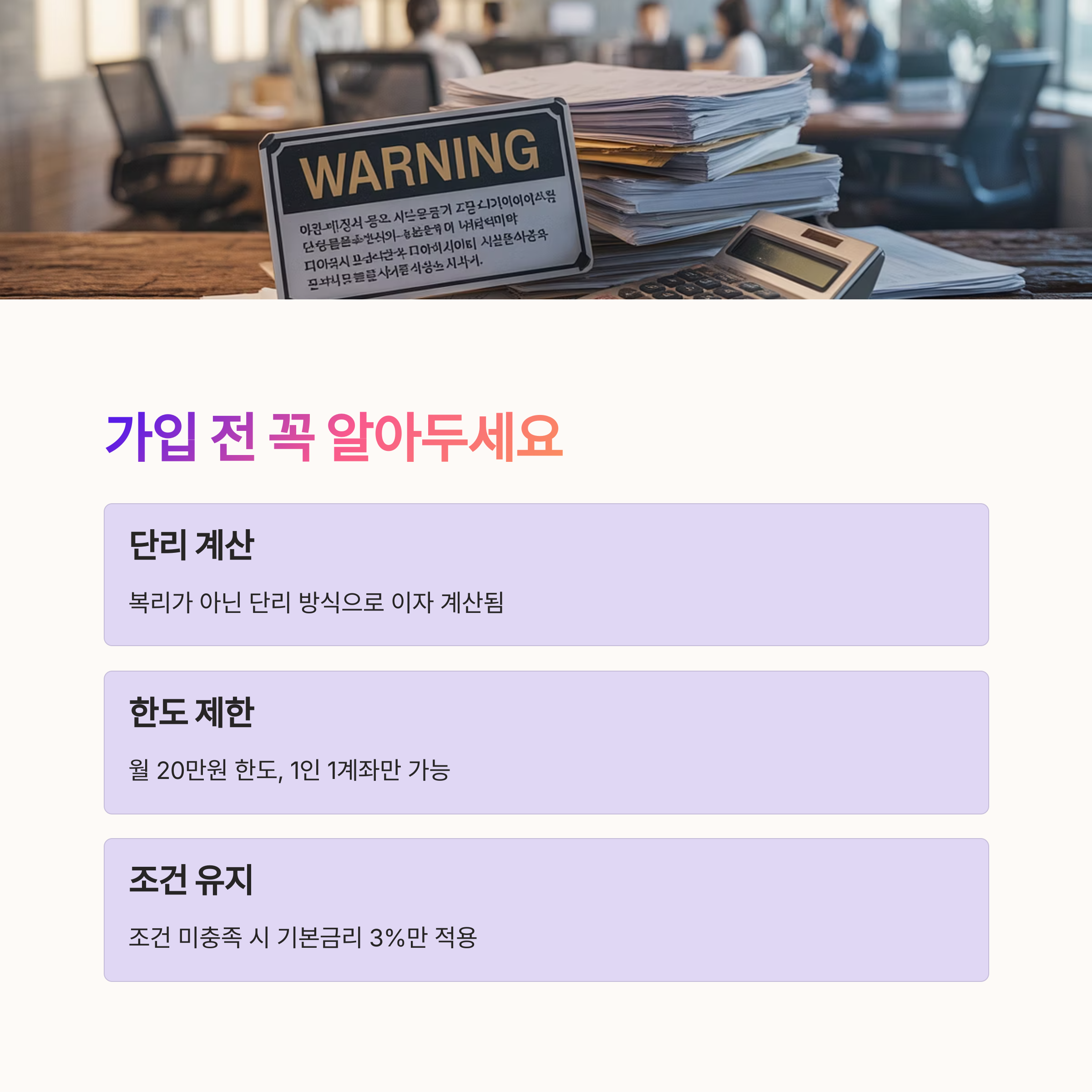 해당 상품은 1인 1계좌만 가능하며, 월 납입 한도는 최대 20만 원입니다. 비대면 가입도 가능하여 모바일 앱을 통한 신청이 간편합니다. 하지만 단기간 자금을 묶을 수 있는 여유가 있는 경우에만 추천되며, 중도해지 시 금리 손실이 발생할 수 있습니다. 적금 특성상 복리 아닌 단리 계산이 적용되며, 세후 수령액도 꼭 계산해보시기 바랍니다.