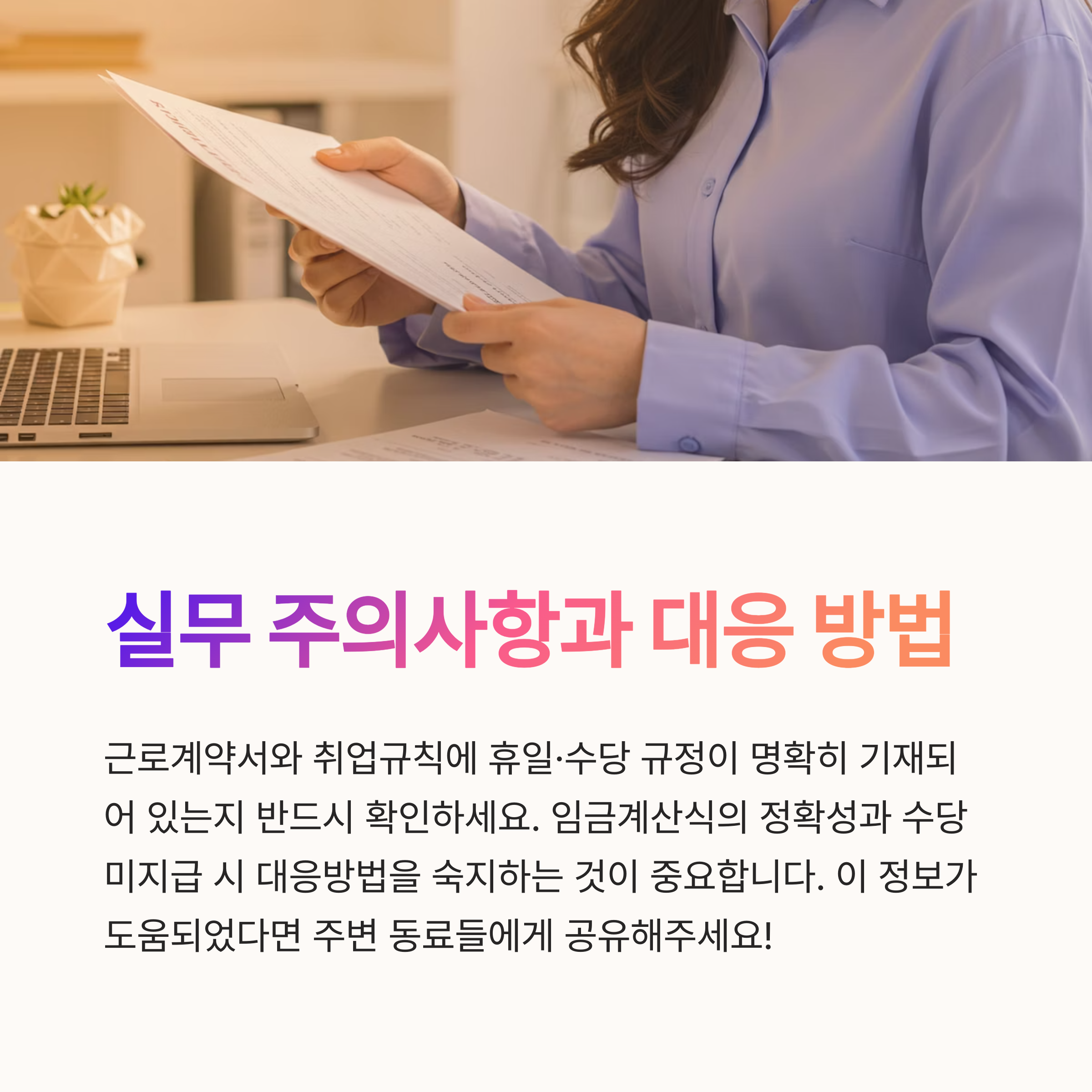 "수당 누락은 자주 발생하는 문제이므로, 근로자가 먼저 챙겨야 합니다." ✅
