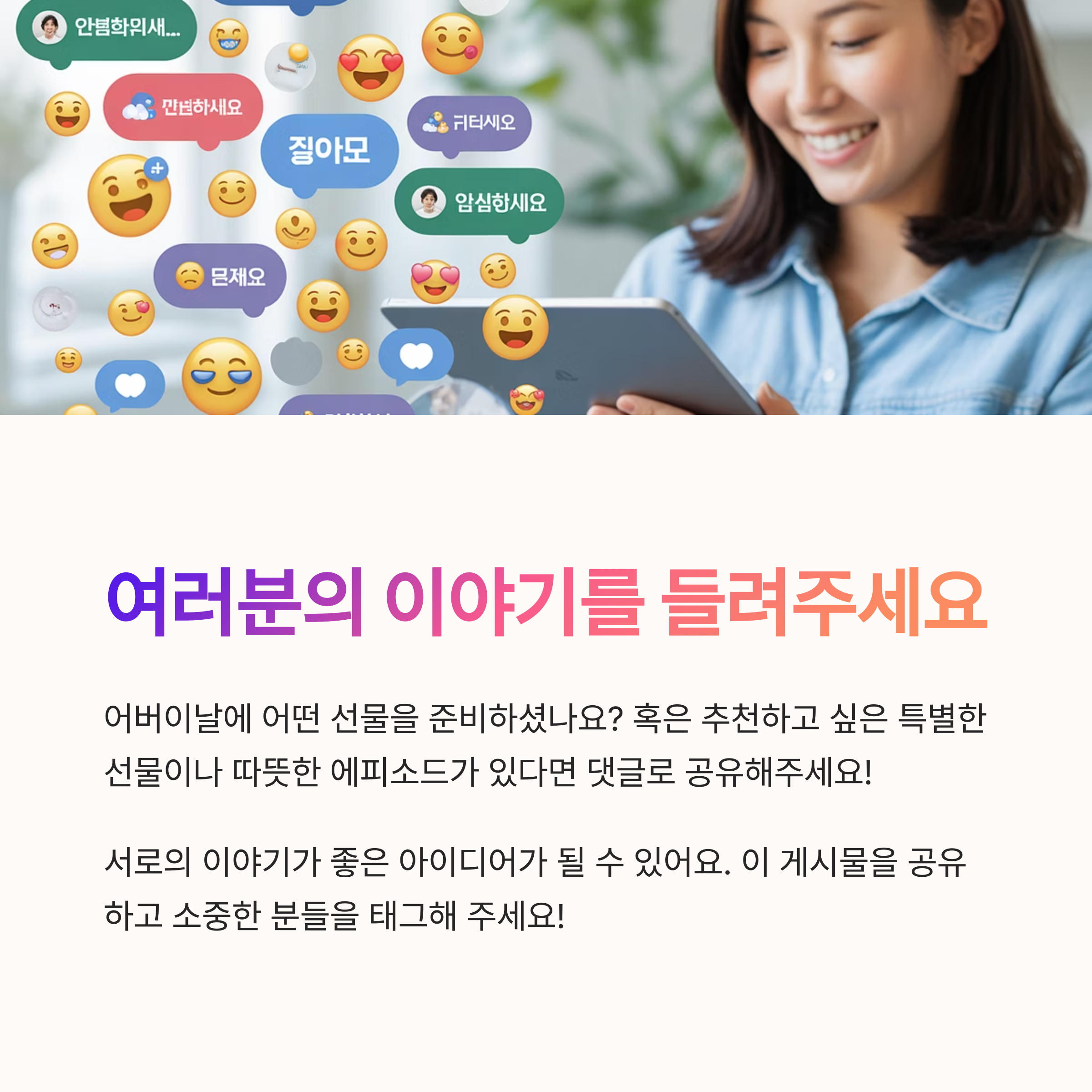 여러분은 어버이날 어떤 선물을 준비하셨나요? 혹은 추천하고 싶은 특별한 선물이나 따뜻한 에피소드가 있다면 댓글로 공유해주세요! 서로의 이야기가 좋은 아이디어가 될 수 있어요.