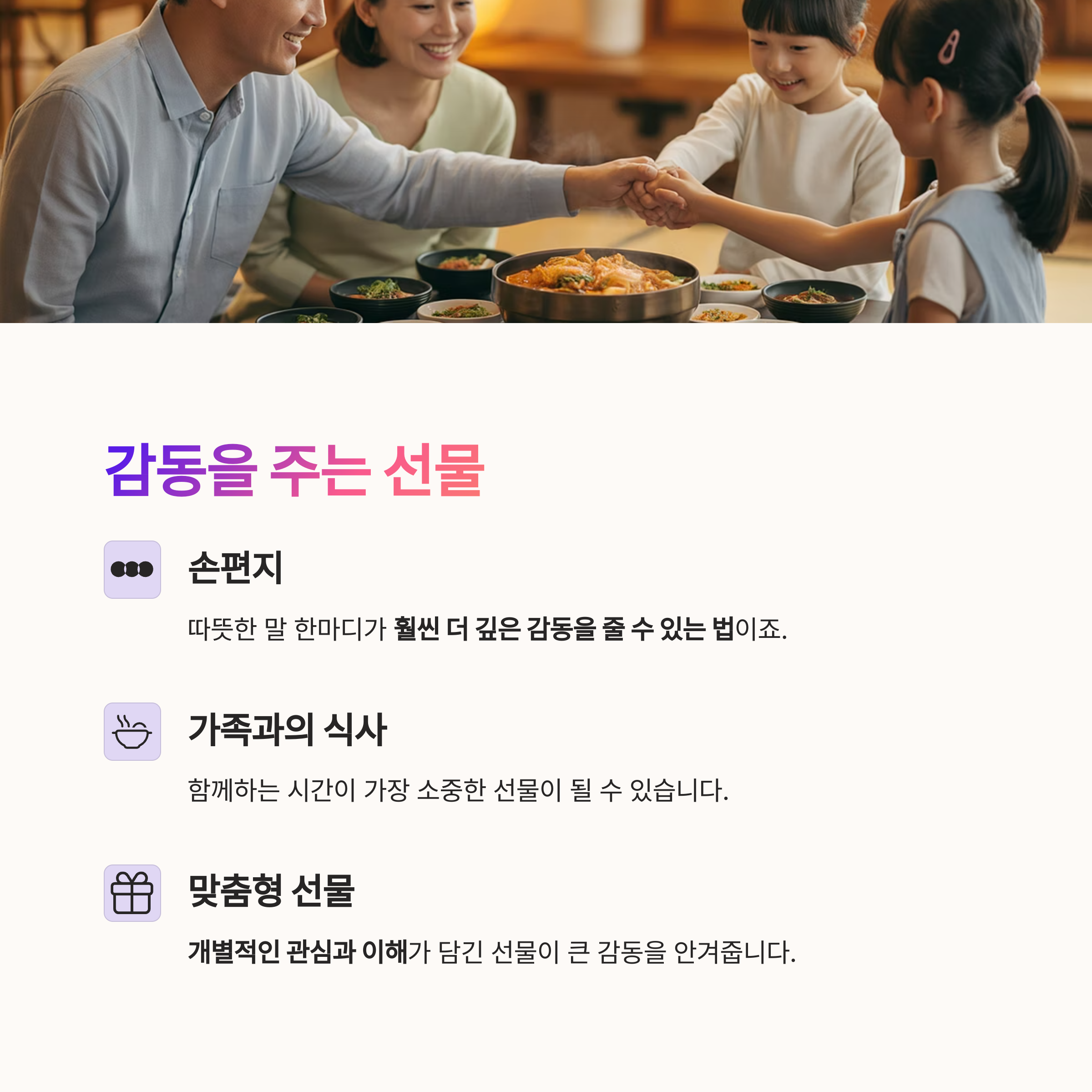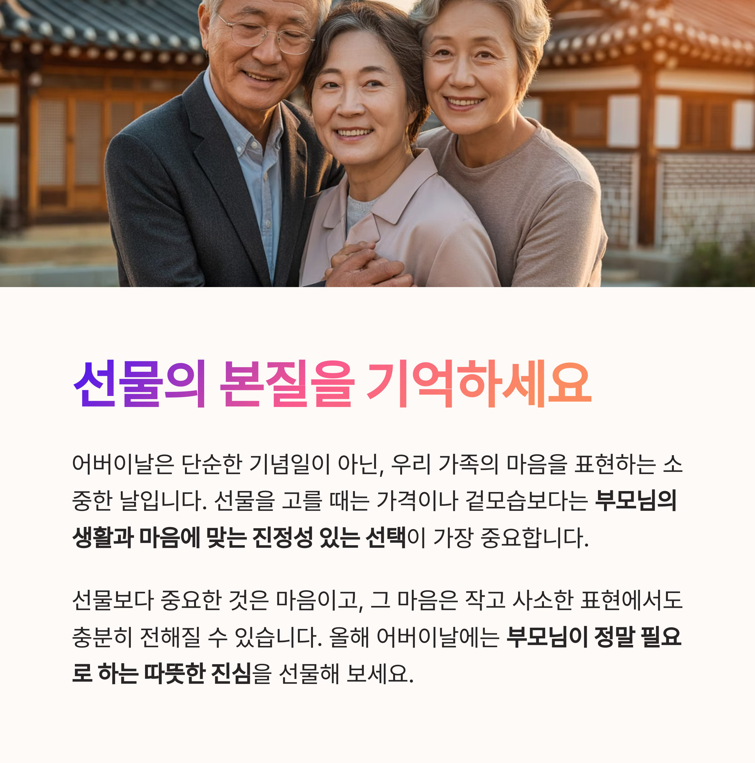 | 매해 반복되지만 매번 새로워야 해요 | 부모님이 원하지 않을 수 있어요 | 진심이 담긴 표현이 가장 큰 선물이에요 |