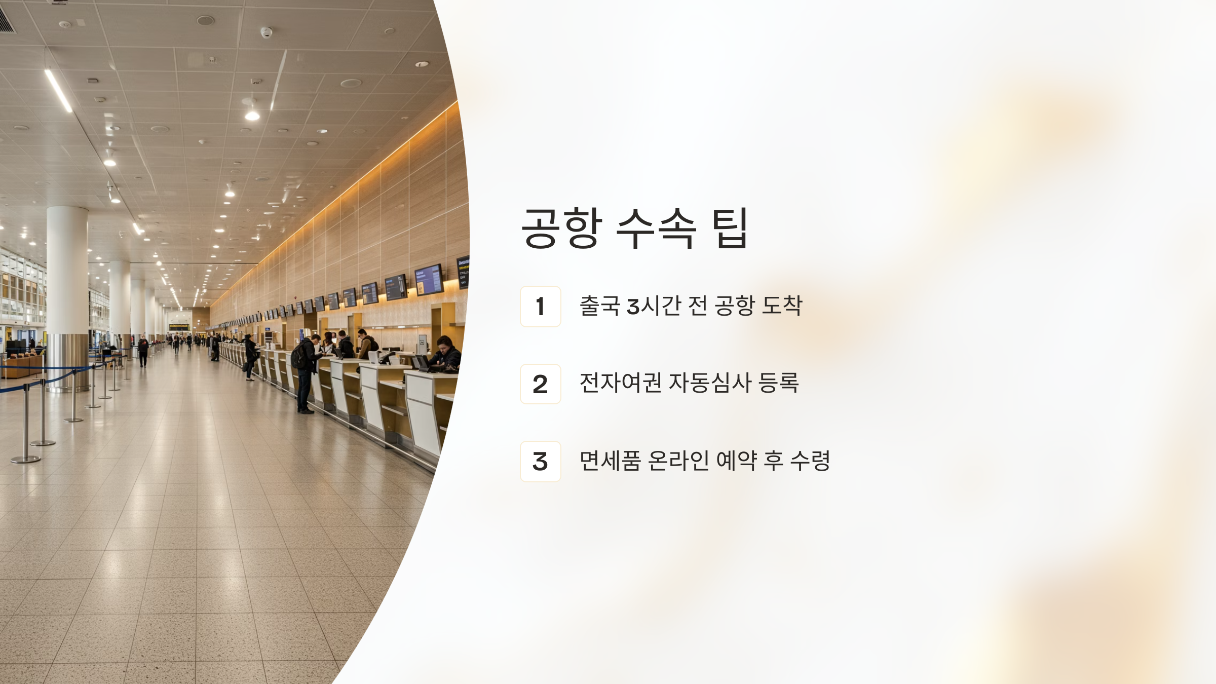 출국 3시간 전 공항 도착이 기본이며, 전자여권 자동심사 등록 시
