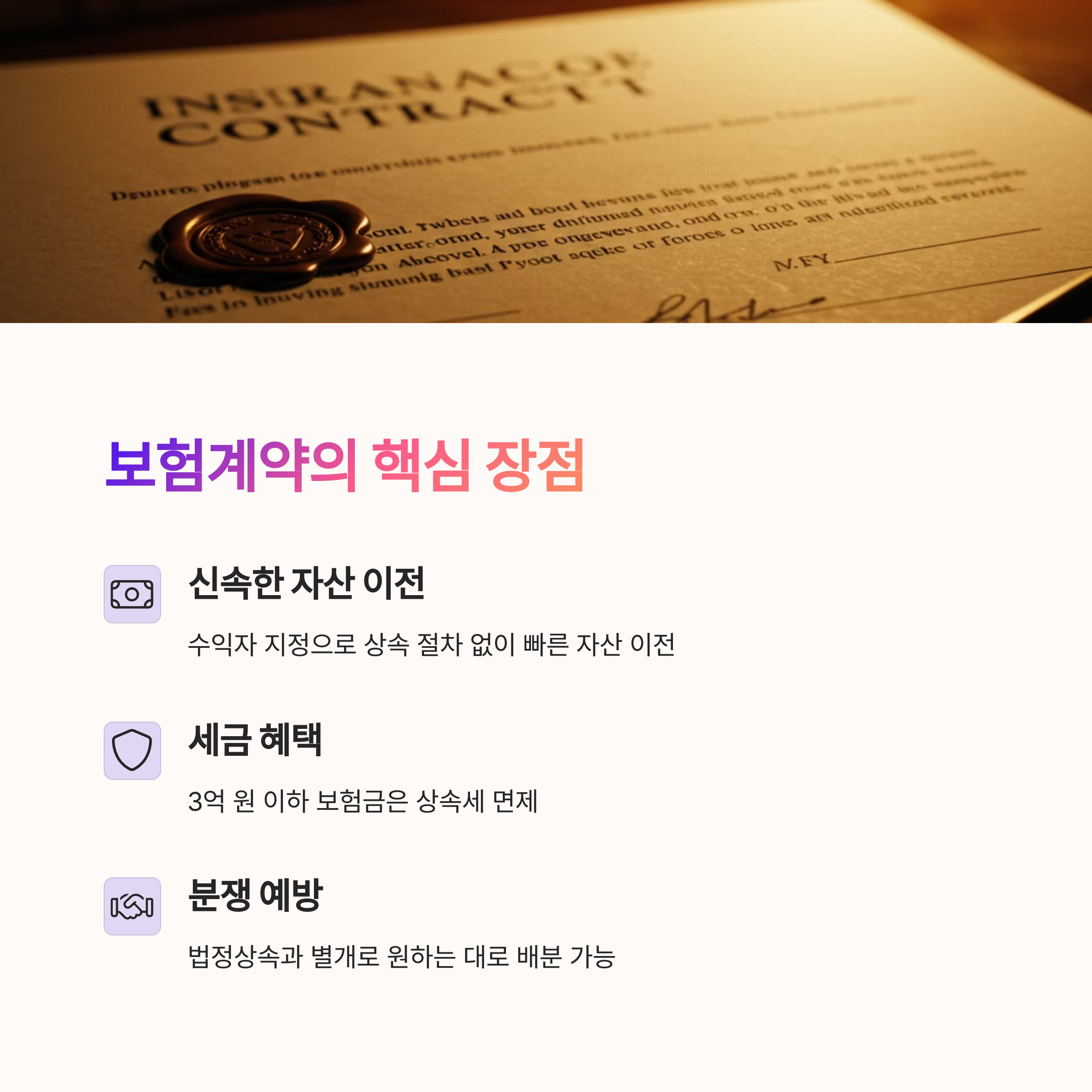 | 보험계약의 장점 | 사망 시 수익자 지정 가능, 절세 효과 존재 |