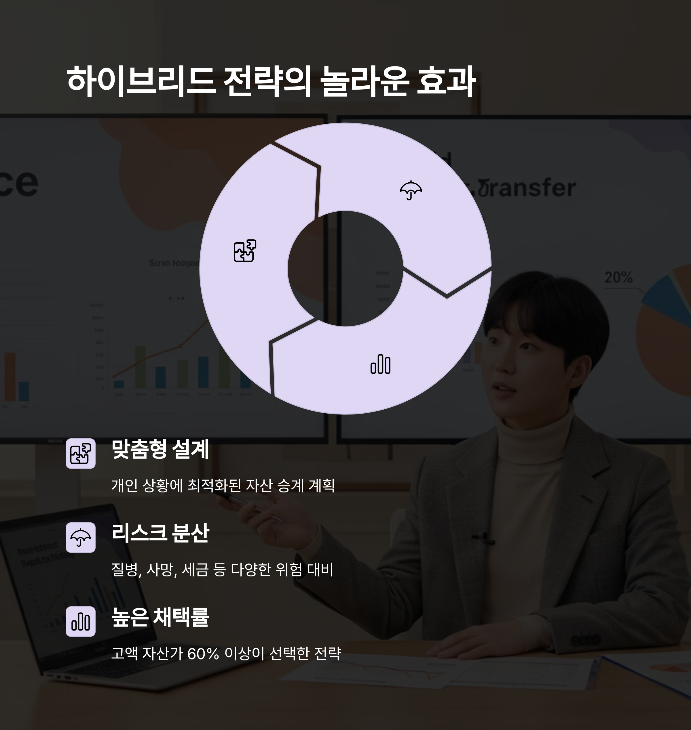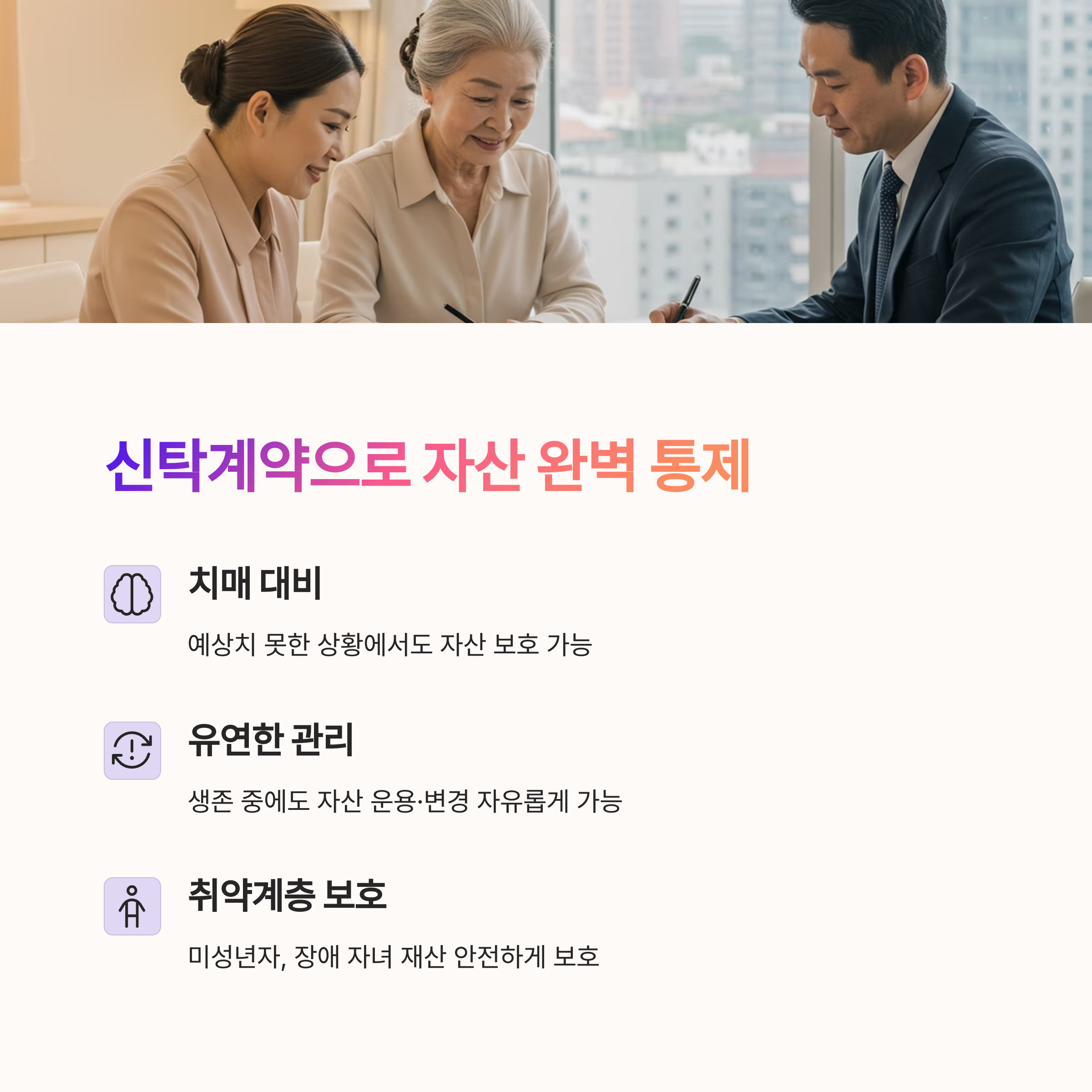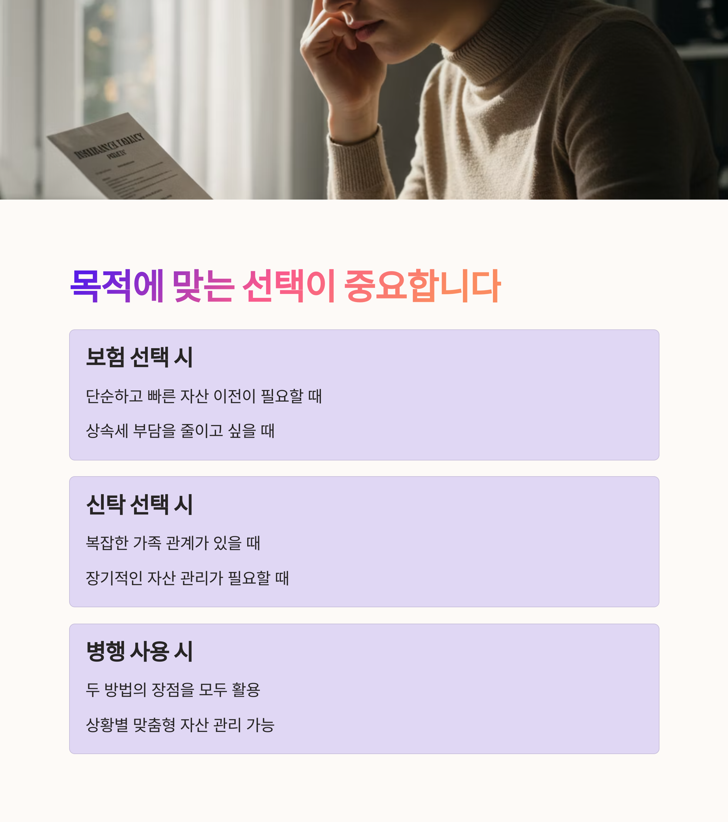| 수익자 지정으로 분쟁 예방, 절세 가능 | 조건부 자산 사용 설정, 생전 통제력 | 목적에 따라 분산 투자 및 절세 설계 |