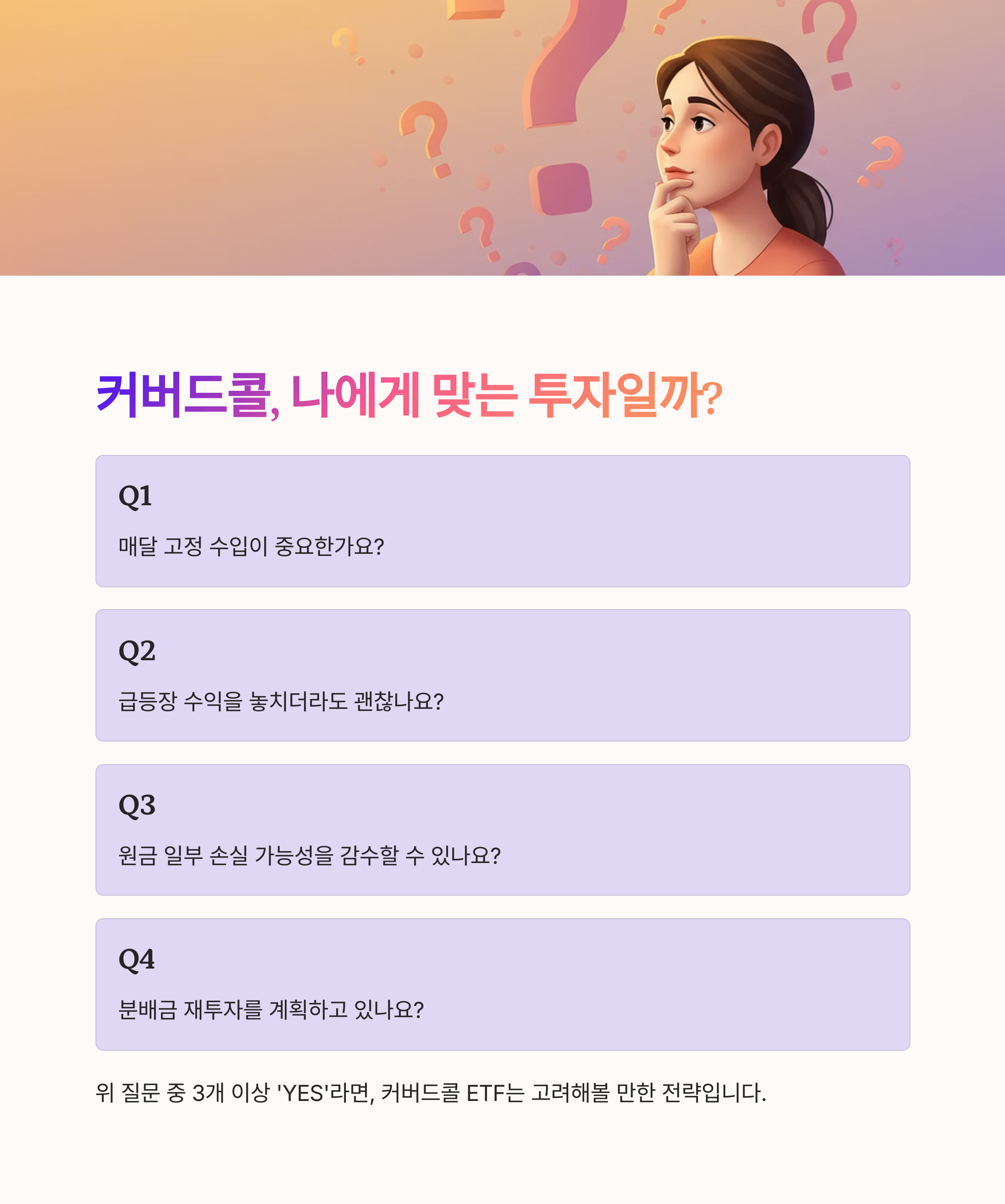 "위 질문 중 3개 이상 'YES'라면, 커버드콜 ETF는 고려해볼 만한 전략입니다."