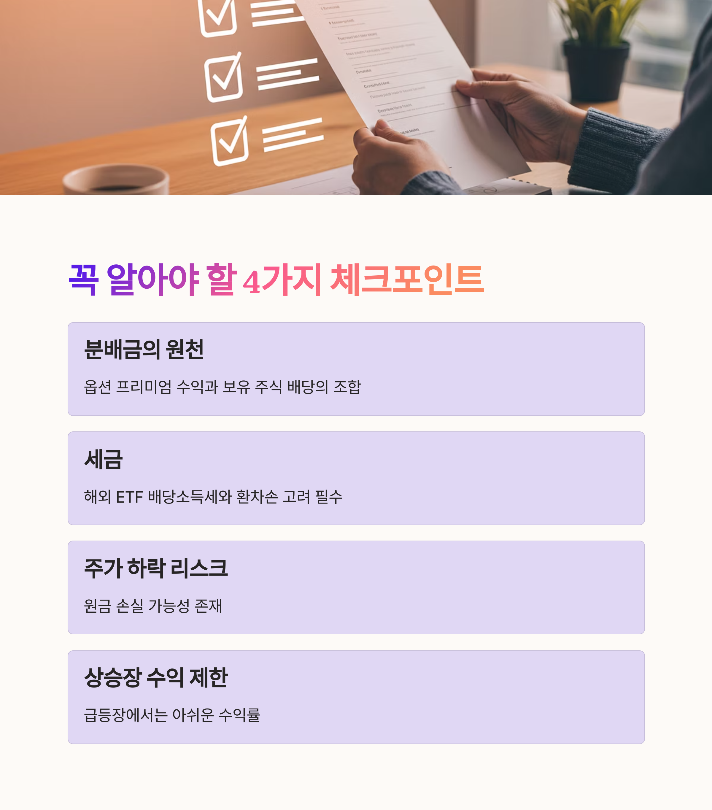 - 분배금의 원천: 옵션 프리미엄 수익과 보유 주식 배당의 조합