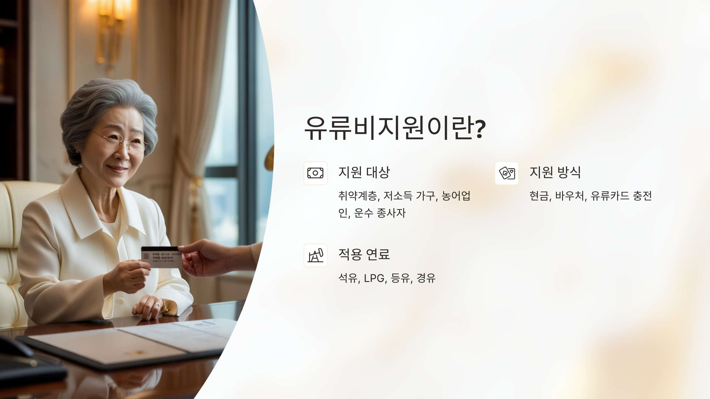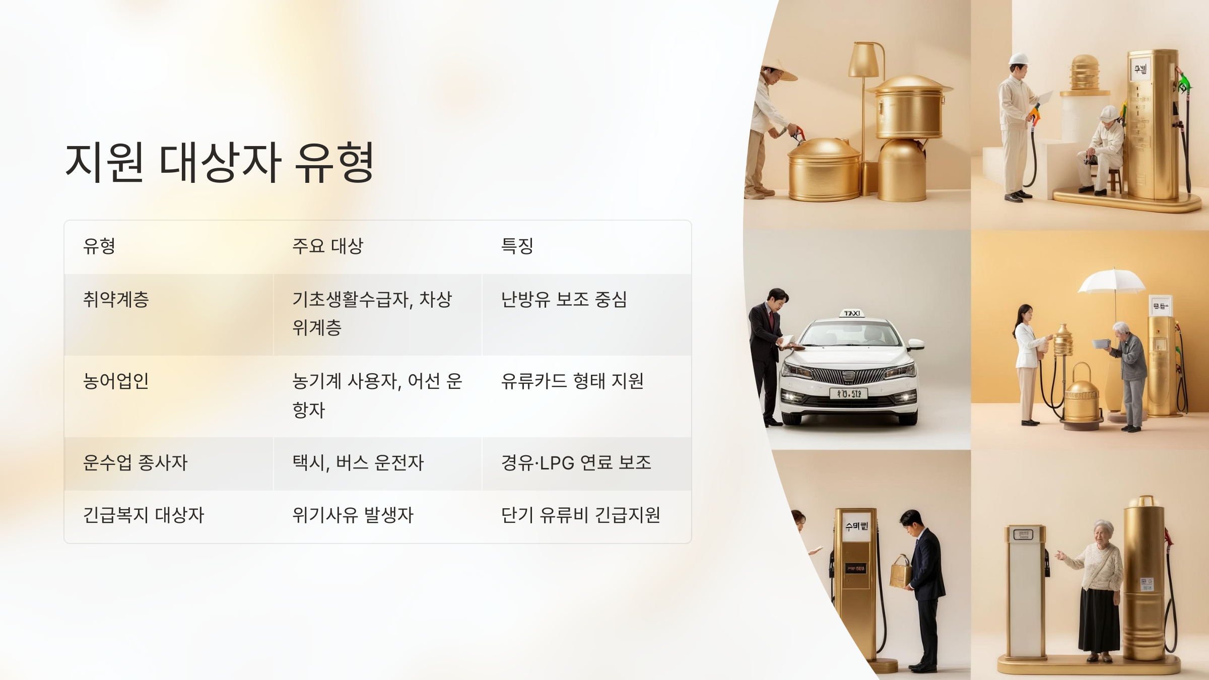 유류비지원은 정부 또는 지자체가 취약계층, 저소득 가구, 농어업인, 운수 종사자 등을 대상으로