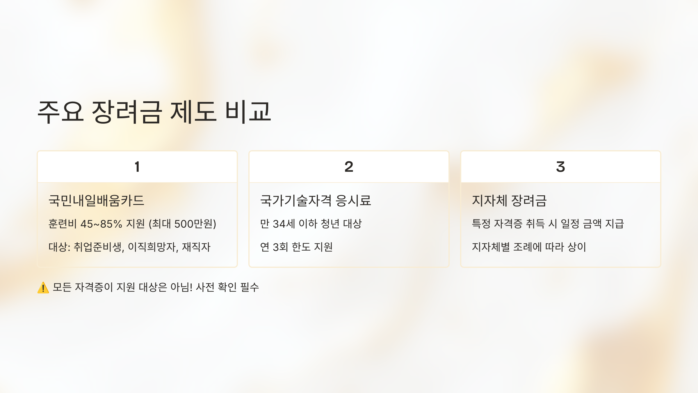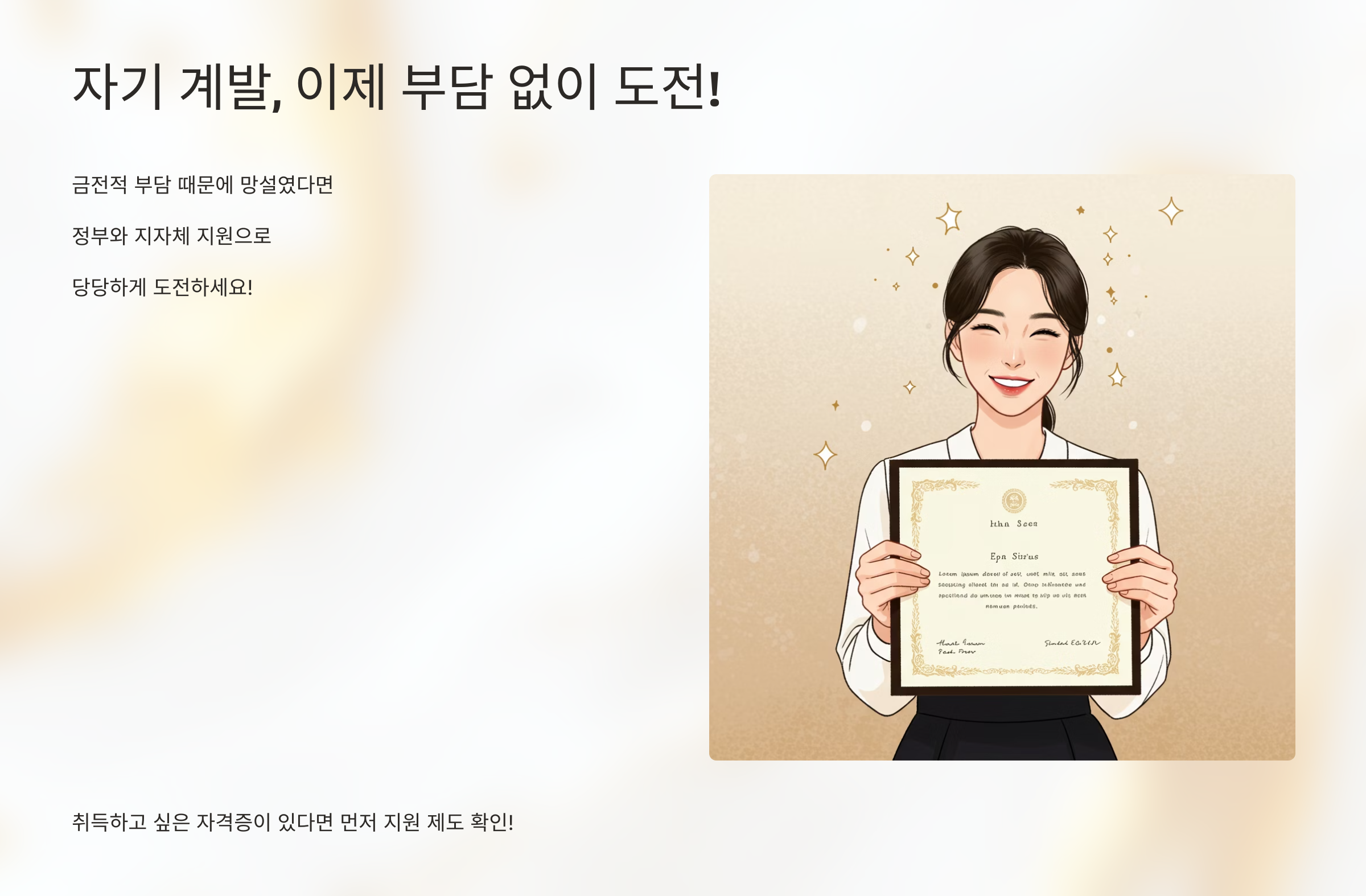 | 지자체별 자격증 취득 장려금 | 특정 자격증 취득 시 일정 금액 지급 (1회성) | 해당 지자체 거주자, 특정 대상 (예: 군인, 청년, 고령층) | 지자체 조례 및 예산에 따라 매우 상이 |