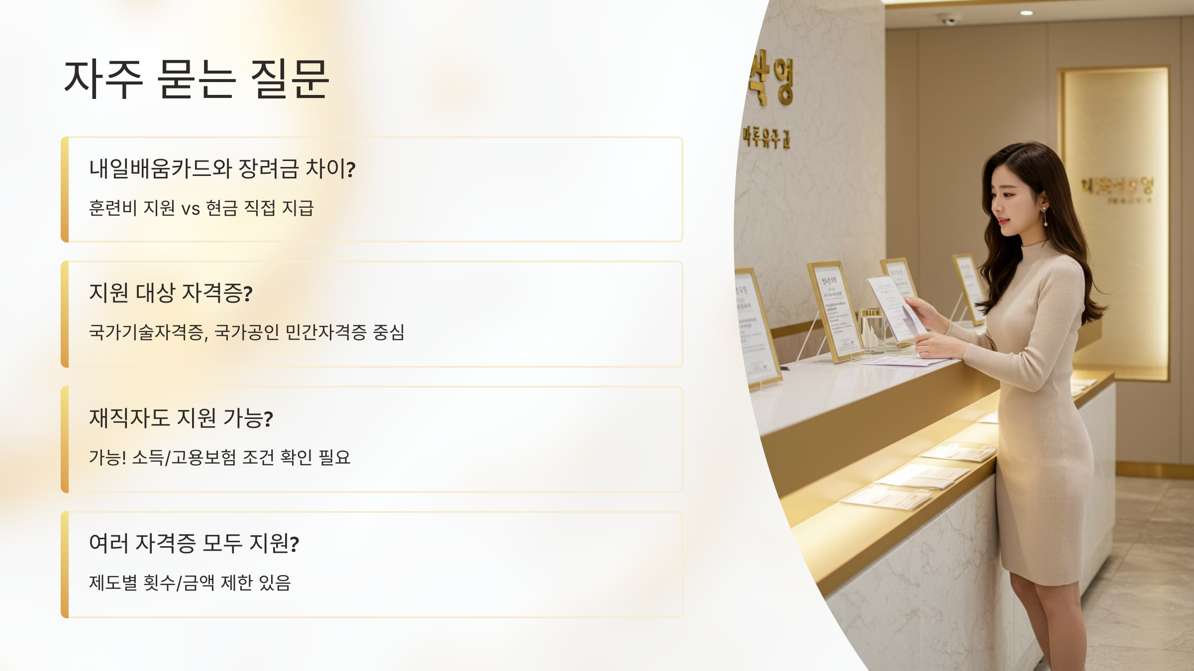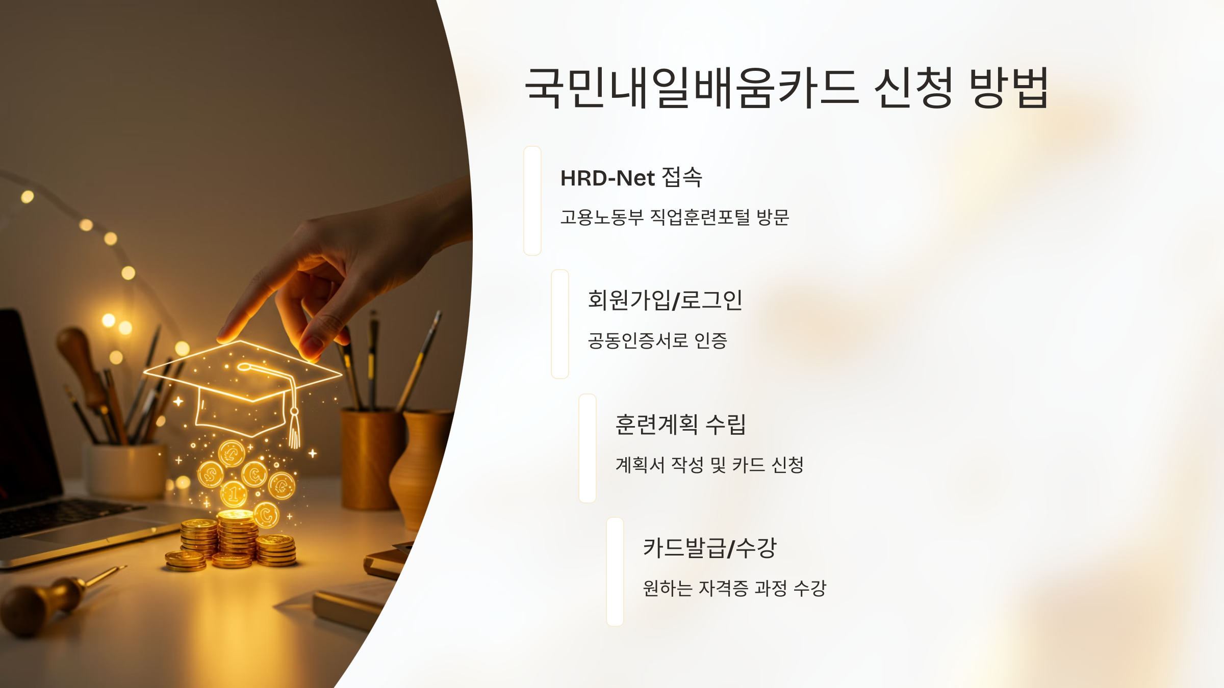 - 카드 발급 및 훈련 수강: 카드 발급 후 원하는 훈련 과정(자격증 취득 과정 포함)을 선택하여 수강하고 훈련비를 지원받습니다.