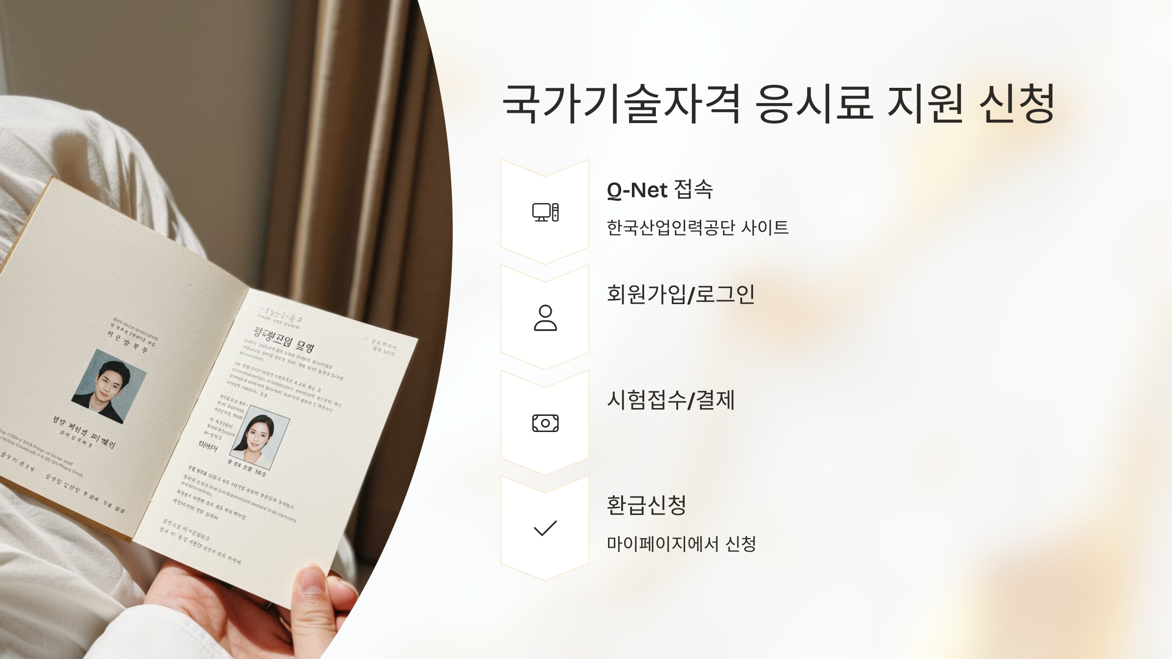 - 응시료 환급 신청: '마이페이지' 등에서 응시료 환급 신청 메뉴를 찾아 신청합니다. (연령 및 횟수 제한 확인 필수)