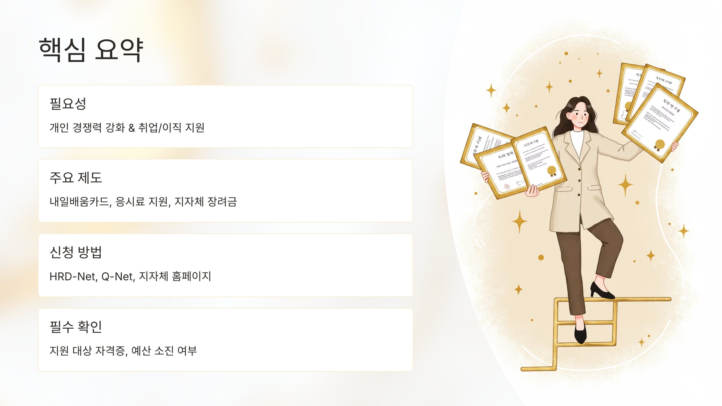 취득하고 싶은 자격증이 있다면 먼저 지원받을 수 있는 제도가 있는지 꼼꼼히 확인하는 것이 중요하답니다. 이 글이 여러분의 배움과 성장에 도움이 되었기를 바라며, 더 궁금한 점이 있다면 언제든지 댓글로 물어봐주세요! 😊