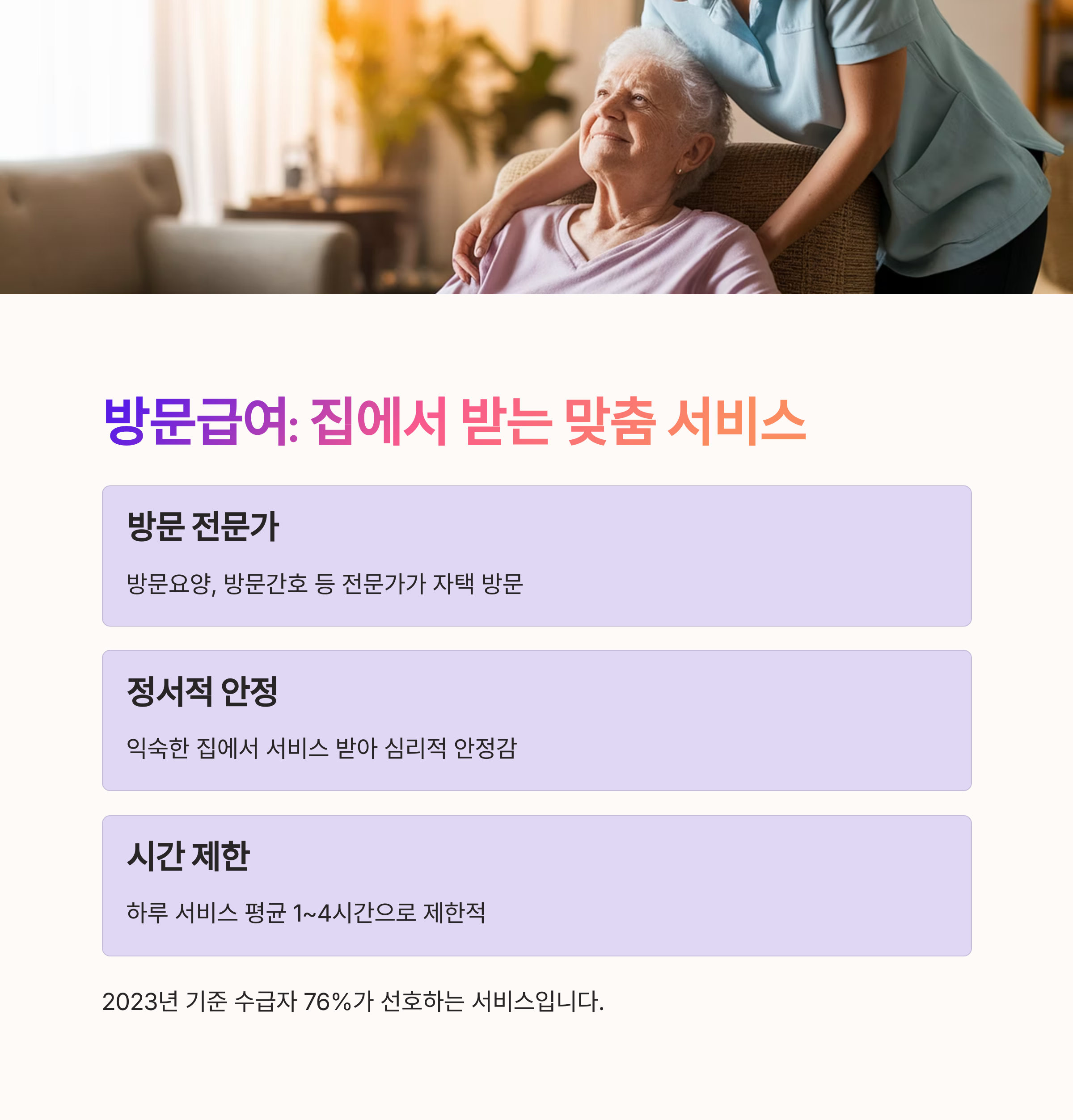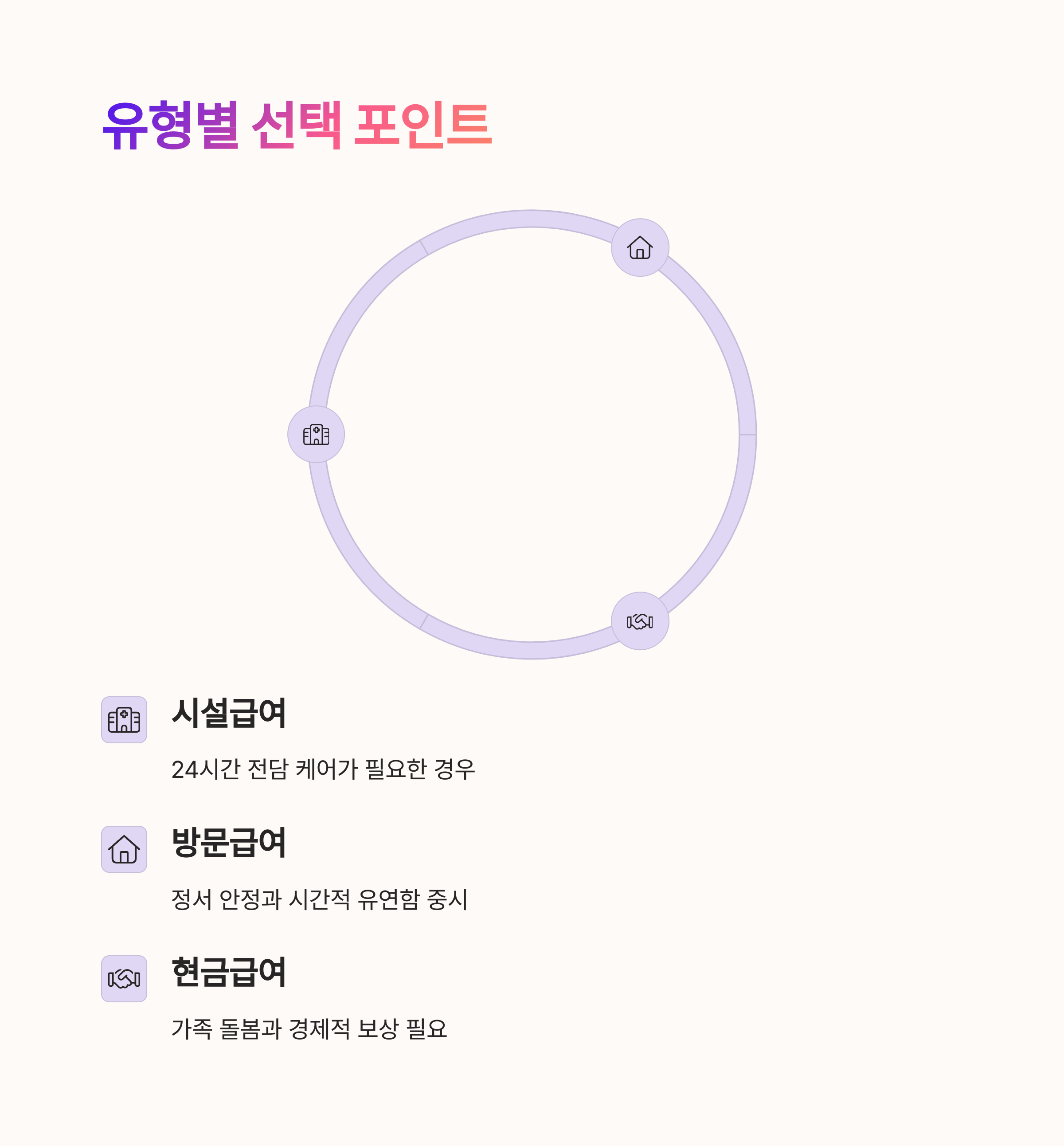 | 급여 선택 기준 | 수급자의 건강, 가족 여건, 돌봄 환경에 따라 달라집니다. |