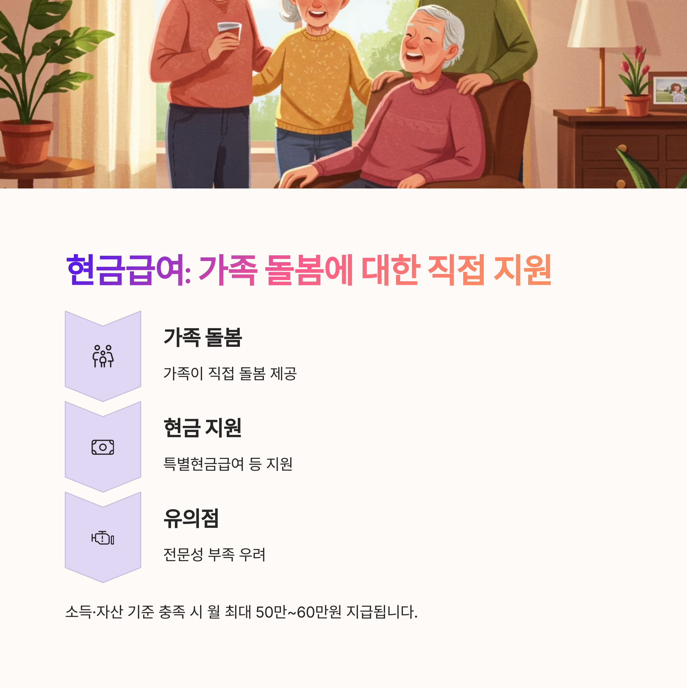 | 요양시설 입소, 24시간 전문 케어 제공 | 자택 방문 서비스, 가족과 병행 가능 | 가족이 요양 시 현금 형태로 급여 지원 |