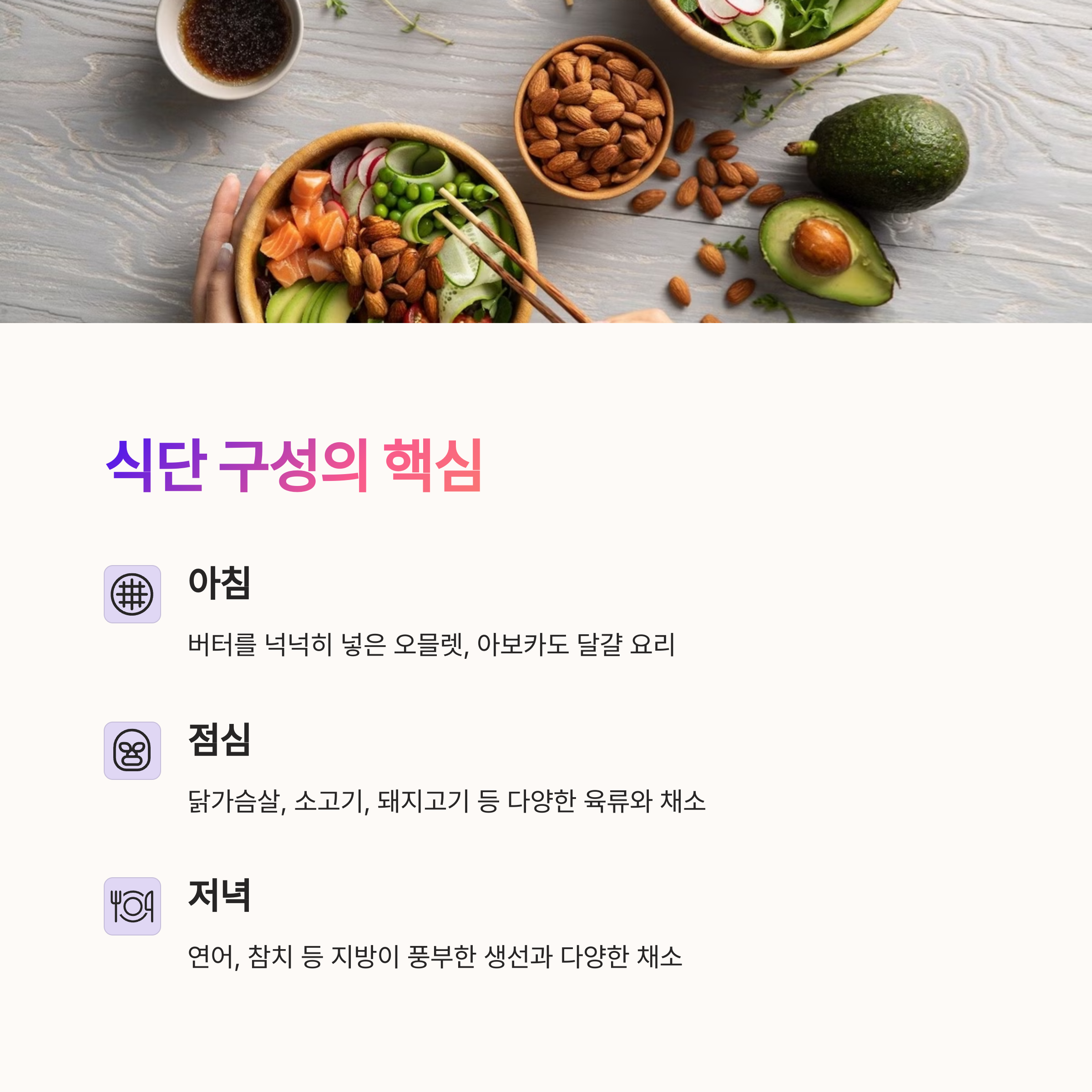 | 식단 구성 팁 | 단백질과 채소를 중심으로 메뉴를 설계하세요. |